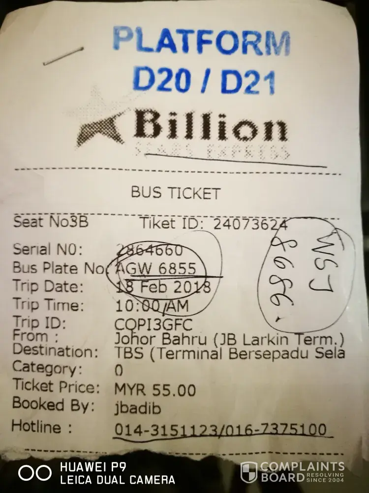 I bought a bus ticket from TBS Kuala Lumpur to Johor Larkin Station on February 2018.