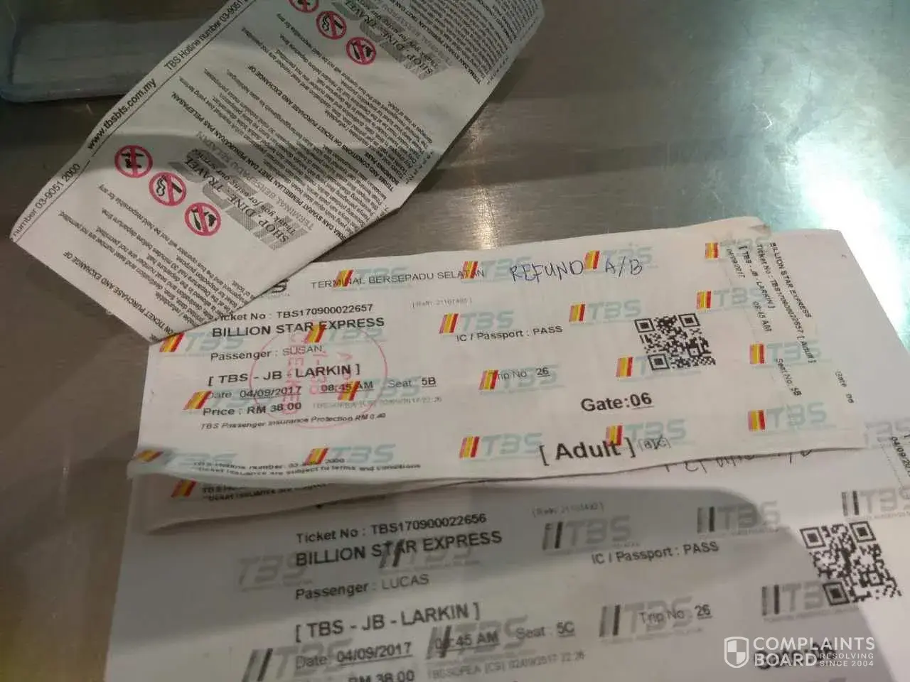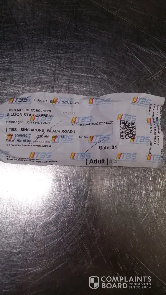On 26 August 2017, I booked two tickets from easybook.com from TBS-KL to Singapore (Beach Road) at 3.30am depart for RM55/seat. The bus was late 20 minutes and arrives at 3.50. (We got onto AGW 6855 bus) Then the driver stopped at sungai Besi PLUS highway stop for 30 minutes then resume journey. I could not sleep at all due to SMELLY interior and very dirty seats. The recliner broke so I was forced to remain sit straight until Singapore. The aircond vent almost fell off and the lights mostly not working. How can you operate a long-haul coach like this? Then the bus stopped again at Yong Peng another 30 minutes. Then they stopped at Larkin-JB to drop passenger and by 9.15 reach Malaysian custom. By 9.40 we reached Woodlands. The clearing customs at Woodland was late therefore when we got down at 10.00am, the bus already LEFT US. Imagine you are first time travelling in another country and then missed by the bus? It was such a panic moment. I was not the only passanger. There are 3 more passengers left out. Two of them are international passenger. We in a group found out way to the city ourselves. This is unacceptable. The fare was paid to send me to Beach road, instead we took another bus to get there. I demand my money back. The journey was not completed. Please call me [protected] or reply through my email [protected]@gmail.com to respond to this case.