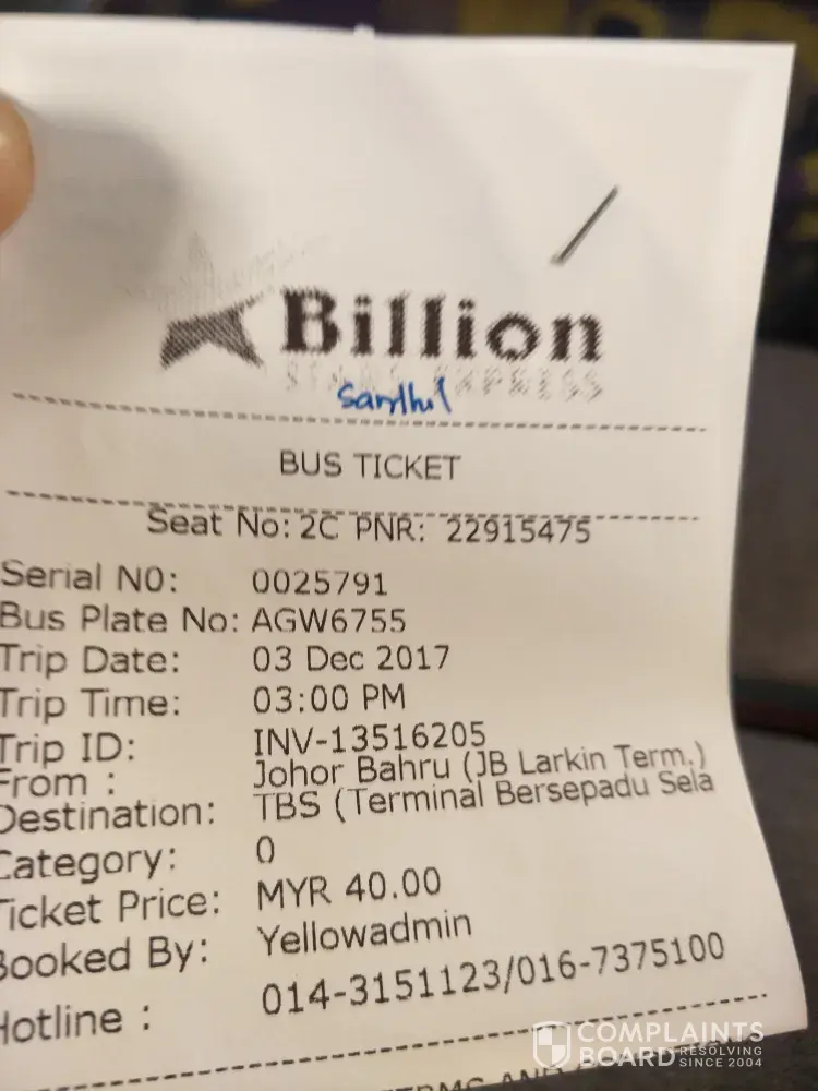 I bought a ticket today at JB Larkin Sentral Billion Express by 12:45pm, requested 1pm the KL non-stop coach can leave in time, mention if not puntual I will make refund. Then I kept the cash balance and ticket rush to platform C39 to boarding coach, just appear ticket show coach number incorrect, change to platform C37 AHD6855. I double check again with driver also said sure non-stop coach, but waiting until 1:15pm finally ticket checker come in, from their talk I found that the coach will stop Tun Aminah & Seremban before reach KL TBS. I straightforward leave the coach and go back to the counter ask for refund done. After reached KL I check my pocket money, appear that I give RM100 upon that time but the cash balance given by Billion's staff was wrong... due of my careless so that I lose RM50. I will never never never use this coach service again.