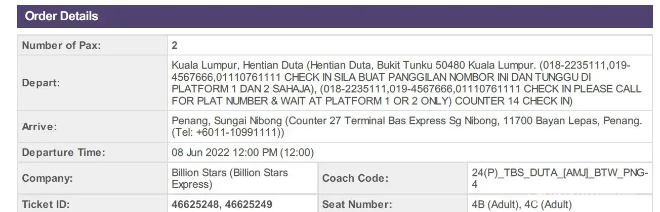 I booked two tickets for Bus from Duta to penang. Bus Time : 08 Jun 2022 12:00 PM .
