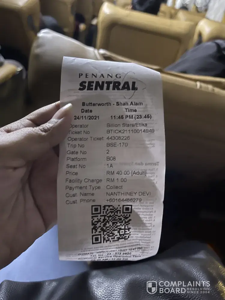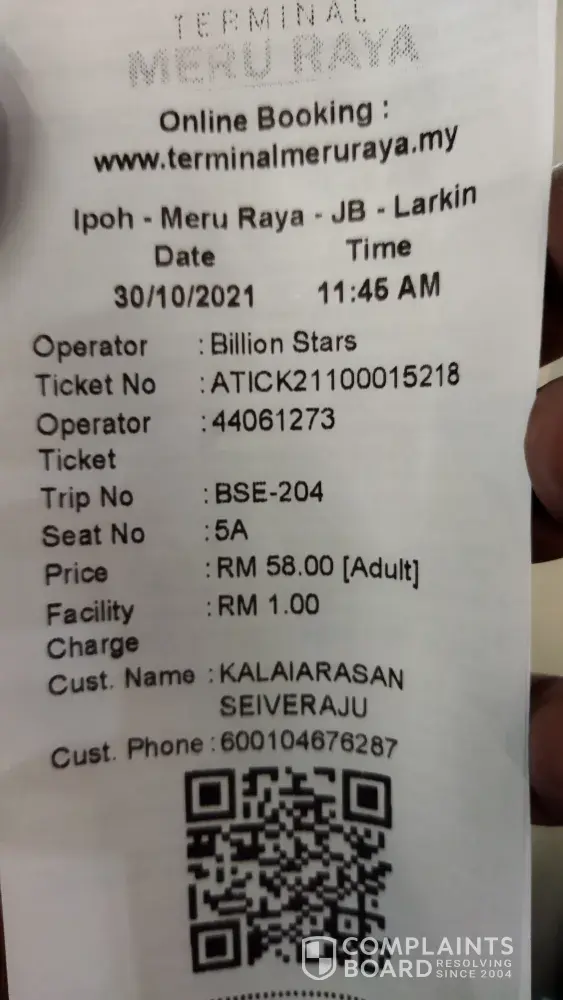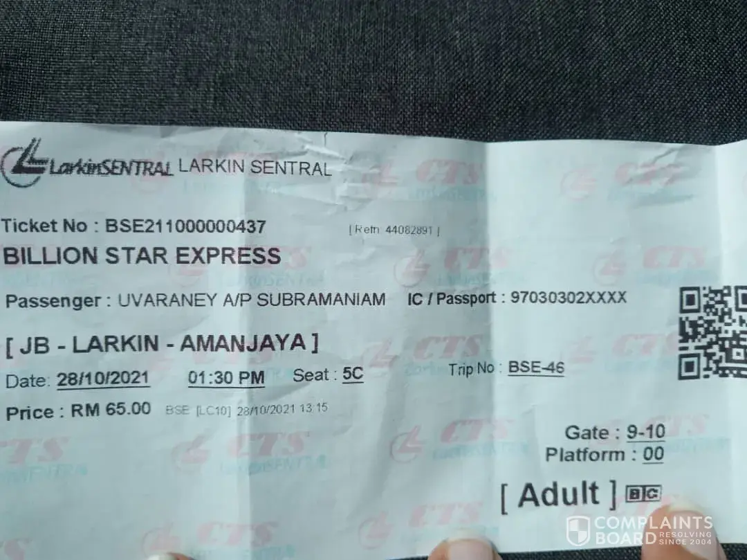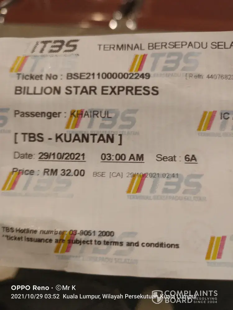 Saya telah membeli tiket bas Billion Stars pada 28.10.2021 untuk perjalanan dari Stesen Bas Larkin ke Ipoh. Masa bertolak yang dinyatakan dalam tiketnya adalah 1.30pm. Tetapi bas belum lagi bertolak dari stesen bas Larkin sehingga pukul 3.00pm lebih. Saya tengah menunggu 1jam 30minit untuk bas bertolak. Pihak pengurusan pun tidak memaklumkan kepada saya apapun tentang kelewatan dan jika ditanya pekerjanya menjawab dengan sambilewa dan tidak menghormati pengguna. Saya harap pihak tuan mengambil tindakan terhadap perkara ini dan saya memerlukan jawapan atau respon daripada pihak Billion Stars tentang insiden dengan kadar segera.
