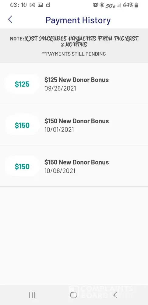 I used a returning donor coupon, 3 payments of $200, totaling $600. After my third donation, I went to the ATM to withdraw, and received the NSF notification . I checked the app and it shows I was not paid. I tried to call, and of course, they don't answer. I drive back there and am informed it's going to take up to 72 hours. A lot of people overheard this and left.