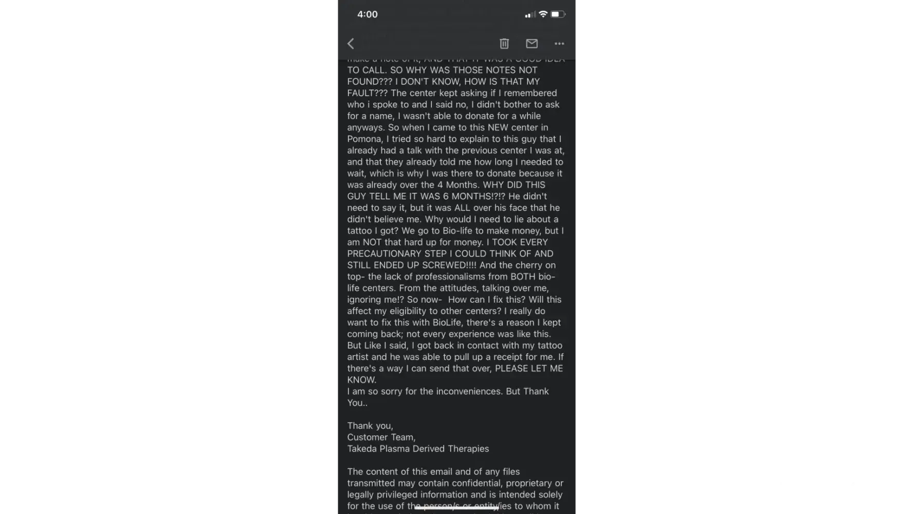 At my last appointment, i was questioned about a new tattoo. Unfortunately, I didn't have any pictures, videos, or anything to prove what day I got it due to my phone being super broken. I explained to my 'nurse' that I had ONE picture and it was from my social media but it doesn't have a date, but it had a countdown to the date (which was in january, but because it was uploaded to my gallery, it didn't show all of that information). THE DATE ON THE PICTURE WAS THE DAY THAT I DOWNLOADED THE PICTURE TO MY PHONE, WHICH WAS APRIL. AND HE TOOK IT UPON HIMSELF TO BELIEVE IT WAS OF 2022(which I guess that could be my fault because in the beginning of the 'interrogation' , I DID say that it might've been around the end of last year , i just couldn't remember because I medically have a memory problem, which I also explained!) MY TATTOO WAS DONE BEGINNING JANUARY OF THIS YEAR AND I FINALLY FOUND A RECEIPT TO PROVE IT! I WASN'T THAT FAR OFF FROM MY GUESS, SO WHY DID IT GET TO APRIL 2022 ? . Nonetheless, that is why I am sending this email. My 'nurse' said when I find proof, to contact Bio-Life. I am unemployed at the moment, I JUST moved back to California, and I can't believe I have to go through this. I took ever precautionary step I could think of taking after I got this tattoo just to make sure I was able to donate by the time I moved back to Cali, and at the end, I still ended up screwed? I called my center in Texas the day after this happened because when I got the tattoo, I was still living there and I called them to ask how long I had to wait and they even said they would make a note of it, AND THAT IT WAS A GOOD IDEA TO CALL. SO WHY WAS THOSE NOTES NOT FOUND? I DON'T KNOW, HOW IS THAT MY FAULT? The center kept asking if I remembered who i spoke to and I said no, I didn't bother to ask for a name, I wasn't able to donate for a while anyways. So when I came to this NEW center in Pomona, I tried so hard to explain to this guy that I already had a talk with the previous center I was at, and that they already told me how long I needed to wait, which is why I was there to donate because it was already over the 4 Months. WHY DID THIS GUY TELL ME IT WAS 6 MONTHS!?!? He didn't need to say it, but it was ALL over his face that he didn't believe me. Why would I need to lie about a tattoo I got? We go to Bio-life to make money, but I am NOT that hard up for money. I TOOK EVERY PRECAUTIONARY STEP I COULD THINK OF AND STILL ENDED UP SCREWED! And the cherry on top- the lack of professionalisms from BOTH bio-life centers. From the attitudes, talking over me, ignoring me!? So now- How can I fix this? Will this affect my eligibility to other centers? I really do want to fix this with BioLife, there's a reason I kept coming back; not every experience was like this. But Like I said, I got back in contact with my tattoo artist and he was able to pull up a receipt for me. If there's a way I can send that over, PLEASE LET ME KNOW.