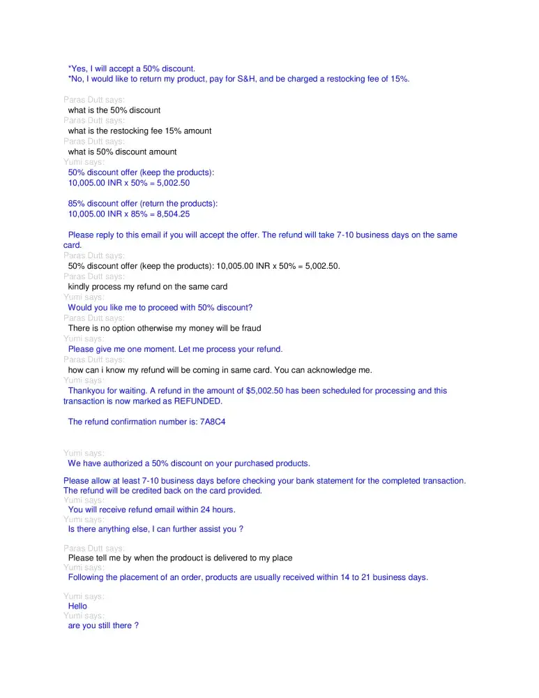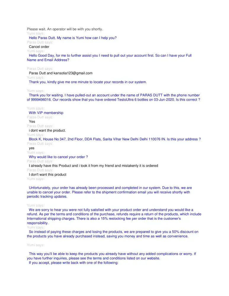 This is regarding the order cancellation in the name of paras dutt by mistakenly order has been placed dated - 3rd june, 2020 and paid rs. 10005. Kindly request you cancel the order of rs. 10005 and please send the money back into the credit card. As per reviews on the google about the company is not satisfactory. They do fraud from recent past years. I have chat conversation with the team and same the girl is all the time. Kindly help me out for with fraud and send my money back in the same card. In future they are using my credit card with on the back side cvv pin.