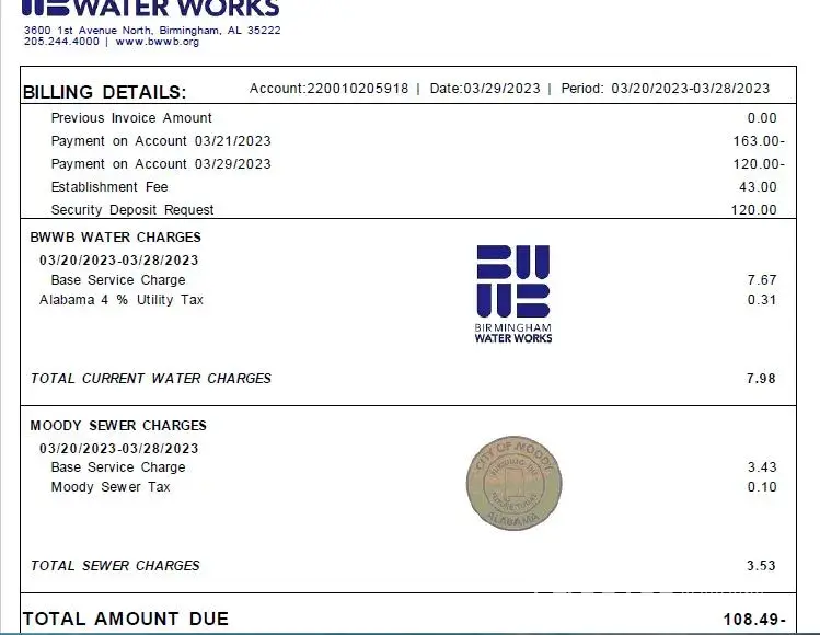 I started service in Moody AL in March 15th 2023. On 3/21 I paid fees to start service of $163.00 and on 3/29th I paid $120.00 for a deposit. On 4/2 I received a bill of $108.49 for water and sewer. This bill is impossible, I could not move into the house until I replaced the flooring and other repairs to make it livable. The bill was for 8 days with almost no water used except for drinking. The base fees for a whole month is currently 38.91 plus water usage. Their math on the bill I downloaded and all the other bills I received besides this one are the same charging almost double what the bill adds up to. I am not disputing the water/sewer usage so far, although the CCF is doubling each month which at $2.23 per CCF is still not concerning, it is the billing that is astounding. Example the latest bill is for usage of 2 CCF so water service is $32.64 for water and $27.27 for sewer, this should be a total of $59.91. Their total is $119.59 all the bills so far are like this. Why is the bill almost double what it should be? How many people are they doing this to? What politician do I have to contact to get this resolved, this is a monopoly you can not choose your water service.