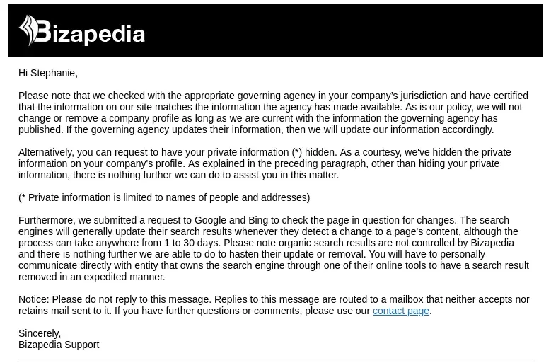 Desired outcome: Bizapedia to delete my personal and company information on the web immediately