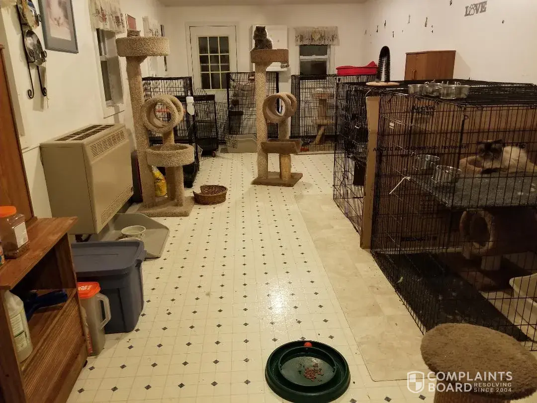 If you understood that cats cant just all live in one area, a program without ways to separate cats means cats are bred back to back and if you have more then one male, you cant know who breeds who. All my cats are in cages that need to be. The buliding is HALF of a garage we built FOR the cats. There ROOM is 12 x 30, has heat, A/C, 5 windows, 2 windowed doors, linolieum floors for disinfecting, painted, curtains, several cat towers, and it was about 15, 000 just to put up the shell. The other half has a 12 x 9 room with a door to go to, for grooming. I have been state inspected and NOW CFA inspected, and if you could only understand males spray...even females spray, You cannot allow cats to just run, piss n breed when n where they want. All my kittens are raised inside my home, born in bedroom, and raised in a safe pen in dinigroom, until age appropriate to start exploring. I have been doing this for 31 years. All my cats get time in our home in turns, and our males get turns running free in the cattery. the cages are twice the required size! I spend lots of time with my cats. YOU and your mother each wrote a letter to CFA, and your MOTHER never even came to MAine to my home! How could she place a complaint? BTW the first 2 complaints in 31 years to CFA? You played with the 3 kittens for 40 min on my didningroom floor and stated how beautiful n healthy they looked? If you had bought a sick, unhealthy kitten, then you could have had a complaint. I ALSO REFUNDED you immediatly even though it was a NON REFUNDABLE deposit. I have many many reviews on my Facebook page, I can give 2 vet referrals that I use, and if any of my cats need medical care, I have the bills to prove they get it. Emergency Ccsections...that cost thousands! I do this for the love of the breed and to share the breed with others. Sorry we could not help you, and I do hope you find what your looking for. Purrrs Susan Bizier, owner and proud Persian Breeder