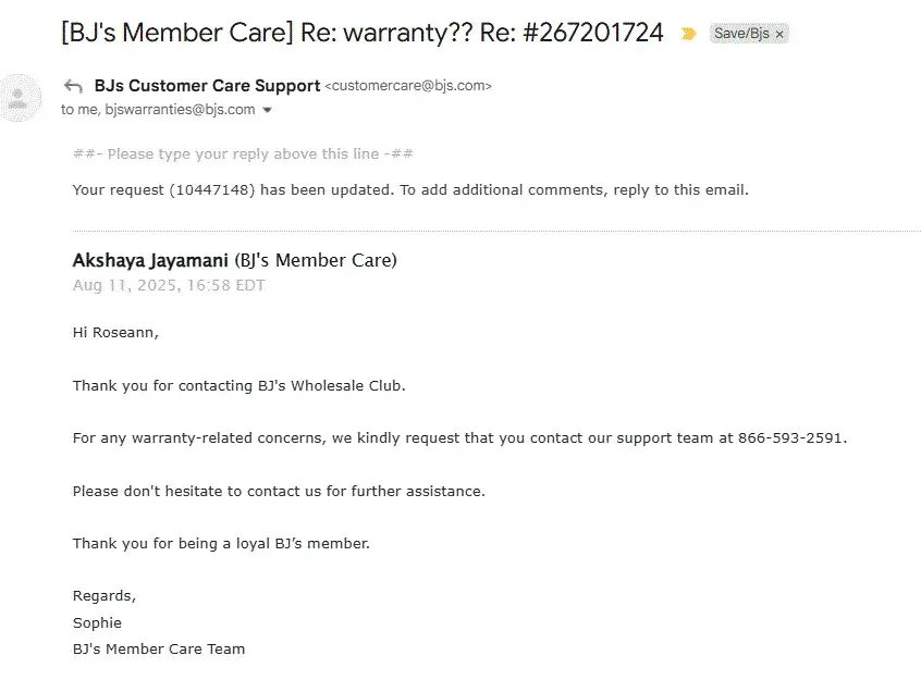 Mon, Aug 11, 4:58 PM bjswarranties@bjs.com