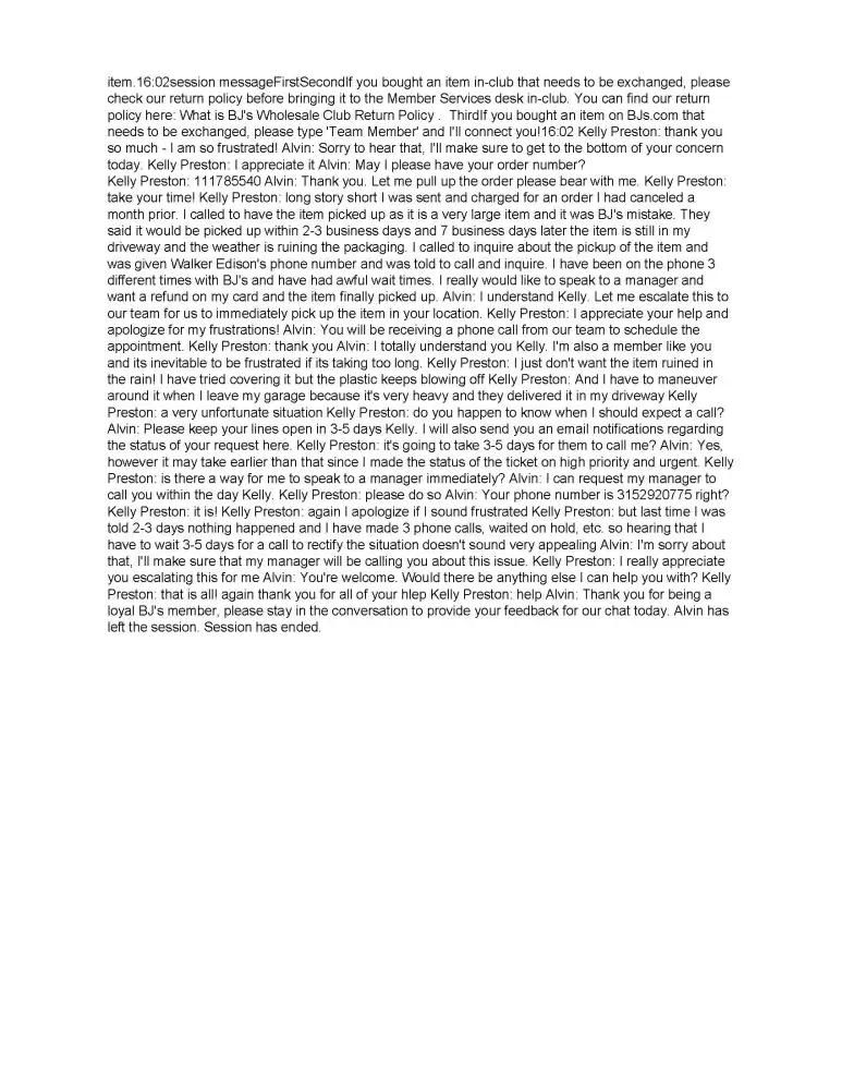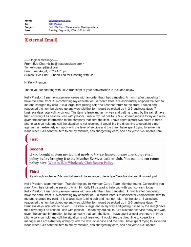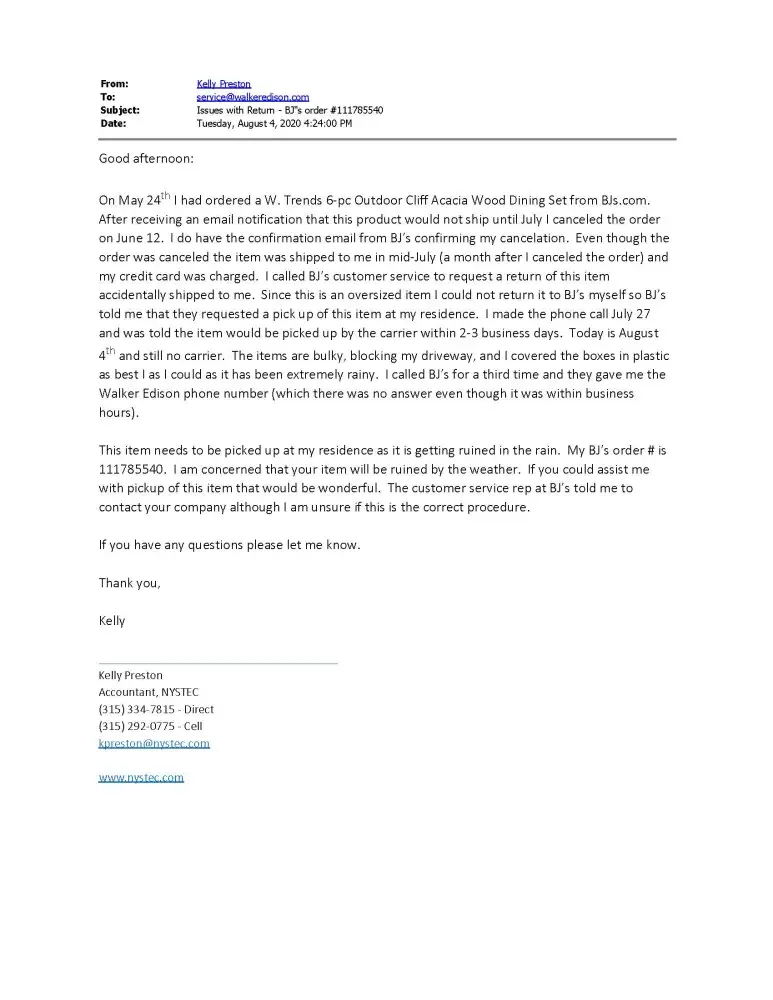 On 5/24/20 I placed an order for an outdoor dining set (order #[protected]) in the amount of $695.99. I received an email from BJ's customer service that, due to shipping delays, I would not receive this item until mid-July. On June 12th I canceled the order as I did not want to wait and wanted the item much sooner (attached is BJ's confirmation email of my cancellation of the order). On July 13th, more than month after I had canceled the order and BJ's had confirmed my cancellation request, I received an email from BJ's (attached) that the order had been shipped. I called BJ's customer service on that date to inquire about the mix up and was told that, when the product was delivered, to call BJ's customer service and request that the item be picked up (as the item is large and heavy and I could not handle returning it to the store due to the weight/size). On July 27th the item was delivered and I called BJ's to request pickup (was on hold waiting for customer service for more than 1/2 hour due to long call waits). When I spoke to the customer service representative I was told that the item, which is large and sitting in my driveway in my way, would be picked up within 2-3 business days. 7 business days later on 8/2/20 I called BJ's customer service again (waiting on hold to speak to someone over half an hour again). This time they said for me to contact the manufacturer of the product myself and that they would also put in another request to have the product picked up. I sent an email to the manufacturer on 8/4/20 (attached) and have not received a reply nor was the item picked up due to a request from BJ's. Since then I have been trying to protect this item from weather/rain and have had it in my driveway in my way. I contacted BJ's again via chat on 8/4/20 (chat transcript attached) and expressed my frustration and requested that I speak with a supervisor. I was told that a supervisor would contact me in 3-5 business days. As of today on 8/11/20 the items have not been picked up, a supervisor has not called me, the issue has not been resolved, and there is still a charge for $695.99 on my card which I requested to be removed but has to be. I am extremely unsatisfied with the customer service I have received as a BJ's member, how long I have spent waiting on hold/communicating with customer service, that my issue has been ignored by management after I requested to speak with management, and that it is still unresolved.