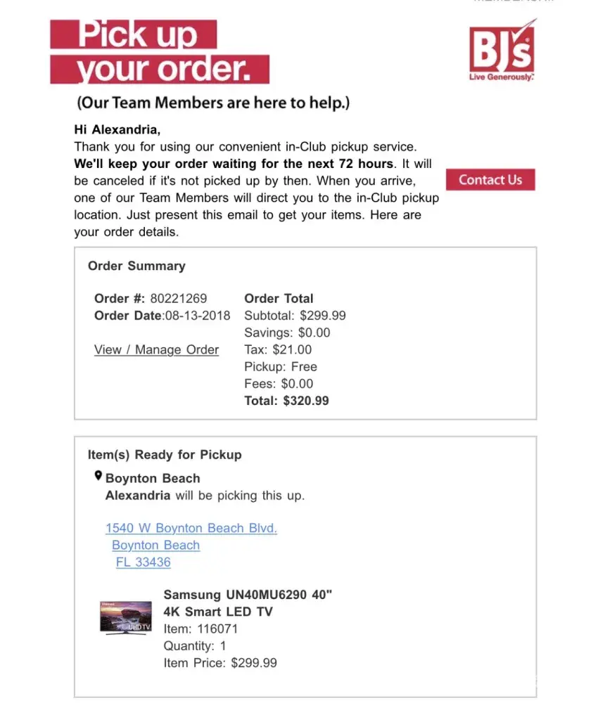 I ordered a television from BJ's Wholesale Club on 8/13/2018 for a pick up order. I went after work to pick it up with my boss as the television would not fit in my car. I arrived and waited in line at customer service and when I got up to the desk the woman told me she could not process the order and asked me to step to the side and wait for the manager who had the keys. I waited with my boss for over 20 minutes for the manager to come back who refused to answer pages to be told that the television was waiting for me in a cart next to the desk and had waited unnecessarily while the customer service rep helped everyone else in line! I ended up leaving and taking the television home slightly annoyed by the inconvenience as I placed the order online ahead of time in order to avoid having to wait a long time. Then today on 8/14/2018 I received an email from my bank that my account had been overdrawn and I had to pay a $20 overdraft charge. Knowing that I hadn't made any other large charges I checked my bank account and BJ's had charged me for 2 TV's! After sitting on the phone with customer service, the credit team, and then a very nasty manager Akiellia D I was told that they cannot find the transaction and that the money would be returned to my account within three business days. I now have had to pay $20 to my bank for the overdraft, plus I am unable to pay other bills that were due this week as a result of this company's negligence. After being unable to do anything to resolve this issue I have cancelled my account as I feel that my financial security has been compromised and this company has absolutely no regard for my business. I will take my business elsewhere and receive much better service. If your company cared at all for their customers I would have received a reimbursement for the $20 fee I acquired for your mistake!