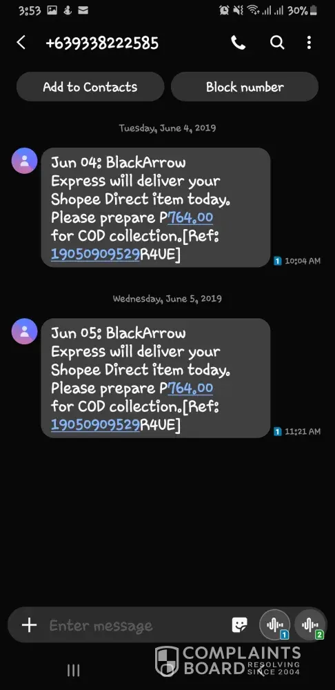 Its been 2 days since i received a text message from black arrow that my item will be delivered by sat. I waited all day but no one came... The next day i also received a text message from black arrow again... And again i waited all day just to received my order from shoppee...but then again i was disappointed... Because no one came... Why do you text the cosignee that their item will be deliver within that day of your text, in a matter of fact no one will be there to deliver their item... Are you joking us guys? This LUNA RANDE OF BLACK ARROW BAE BATINO LAGUNA should be given an action... He does not even text the cosignee if he cant make the delivery...