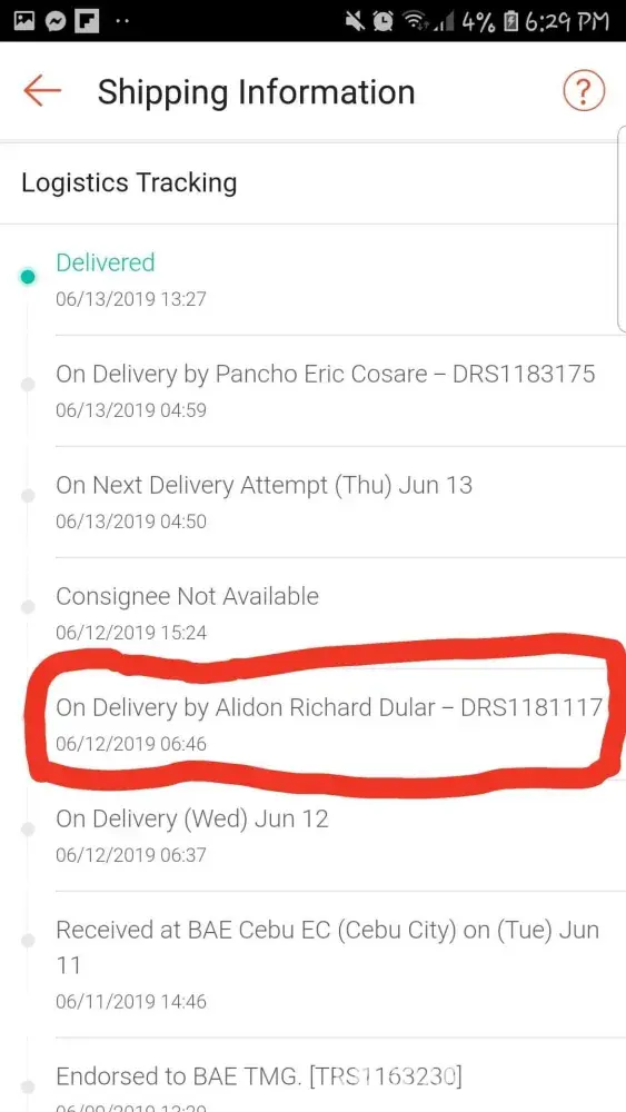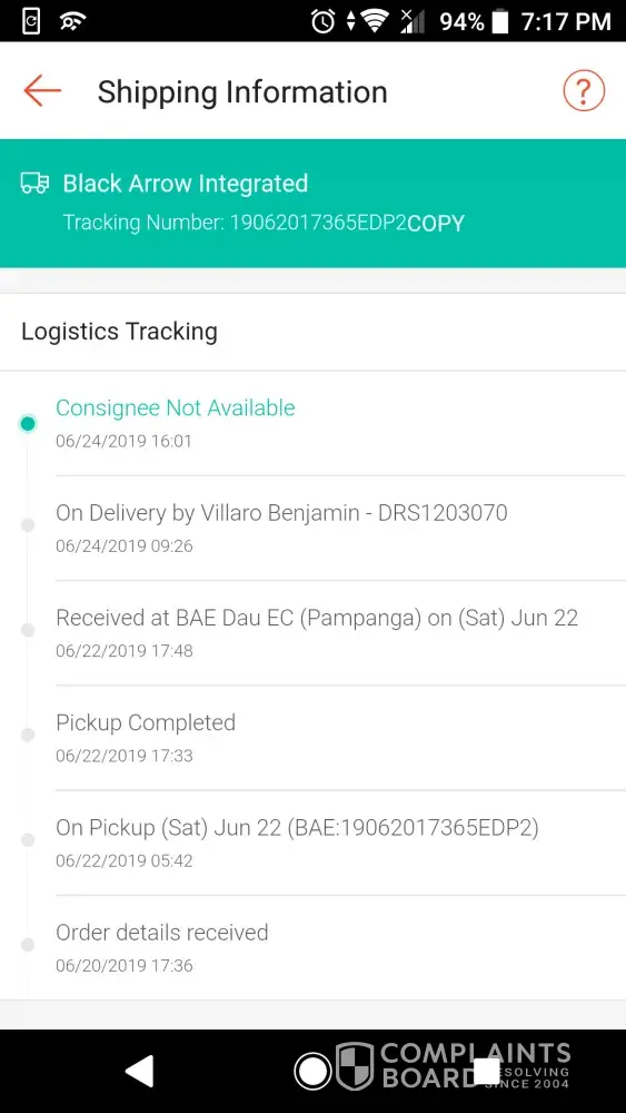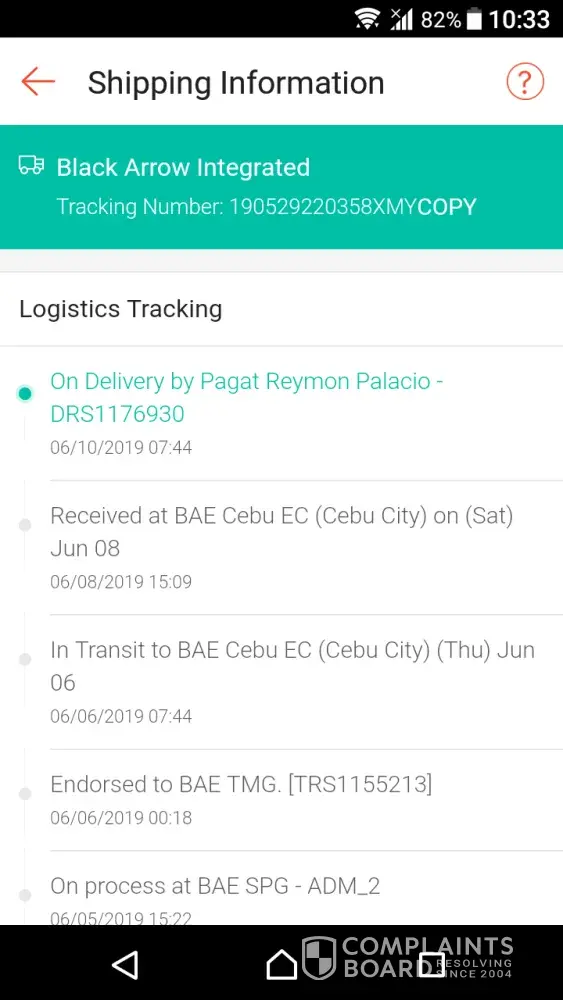 My order which is a dress from Shopee arrived in Cebu City last May 23, 2019 (Friday) according to the order tracker. I received a message yesterday (June 4, 2019) at 10:04am that my order will be delivered and the delivery man called at 11:02am to inform me that he's nearby. He told me that he is already in Pari-an, Cebu City. I was surprised because he was actually quite far from my location. I found out that he misunderstood the delivery location. He thought it's in University of the Visayas-Main (Colon) but it's actually in University of the Visayas-Banilad. He ended the call and I just waited the whole day yesterday until today. I checked shopee's order tracker but I was surprised to see that they indicated CONSIGNEE NOT AVAILABLE twice! I am very worried because it might be returned to sender and I need that dress for my friend's wedding soon. I tried to reach Black Arrow Cebu's contact number which is only one by the way but the line is always busy. I hope to receive my order soon.