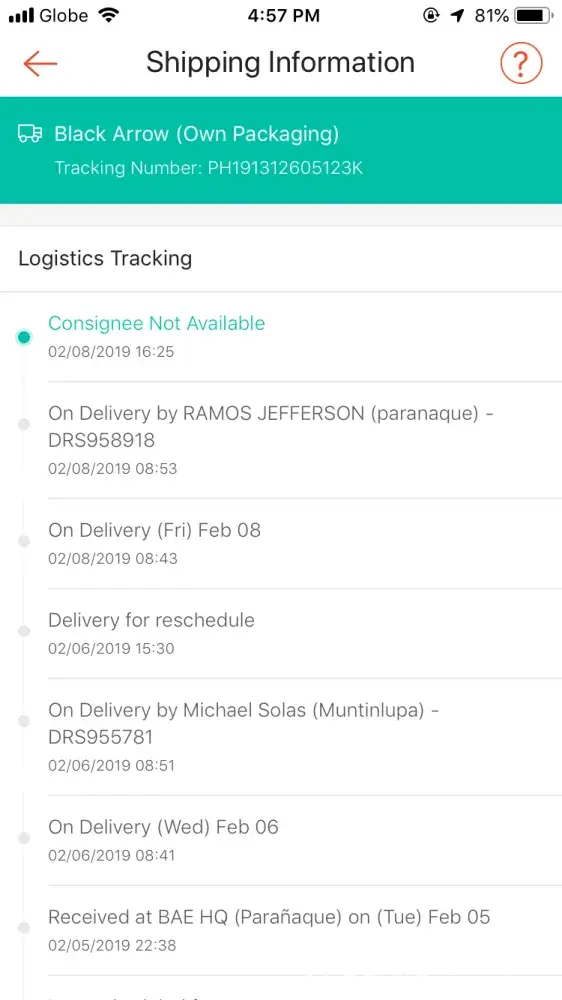 I ordered an item from Shopee. Checking constantly on the tracker logistics, someone named Raymond Mayuyo supposedly delivered my item last Feb15 but I did not receive any message or call about it. The following day, the consignee did not even message me either prior to delivery that it's being sent out.Now the item that I ordered is marked as RTS.