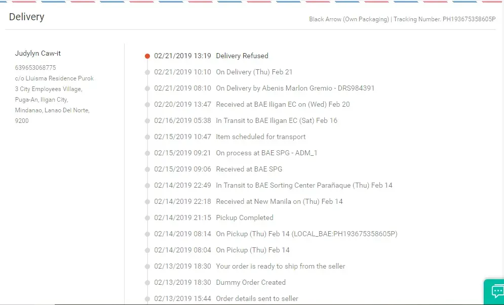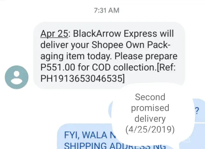 Nag order ako ng item sa shopee, which is supposed to be delivered by the useless shipping carrier na "BlackArrow Express". The day the item status became to be delivered which is by again the useless carrier "BlackArrow Express" nag text sila oh yung delivery man ba yung nag text na darating sila sa araw na to which hinintay naman namin buong araw na galing pa kami work that day sa hanggang nka tulog nlng kami at nka gising around 6:30 pm na wala mn lng text or even missed call from the same number na nag text initially na may darating na item. I then texted kung nasaan na sha oh kung darating pba pero waang reply at all. Pag check ko nlng sa item status ko ulit sa shopee "delivery refused" na! Pambihira wlang kwenta talaga! The next day tinawagan ko yung number na nag text pero dini decline na at di nag reply! Napa na walang kwenta na shipping carrier to, oh baka nmn ung taong nagdeliver lng tlaga yung tanga oh hindi sumipot!
