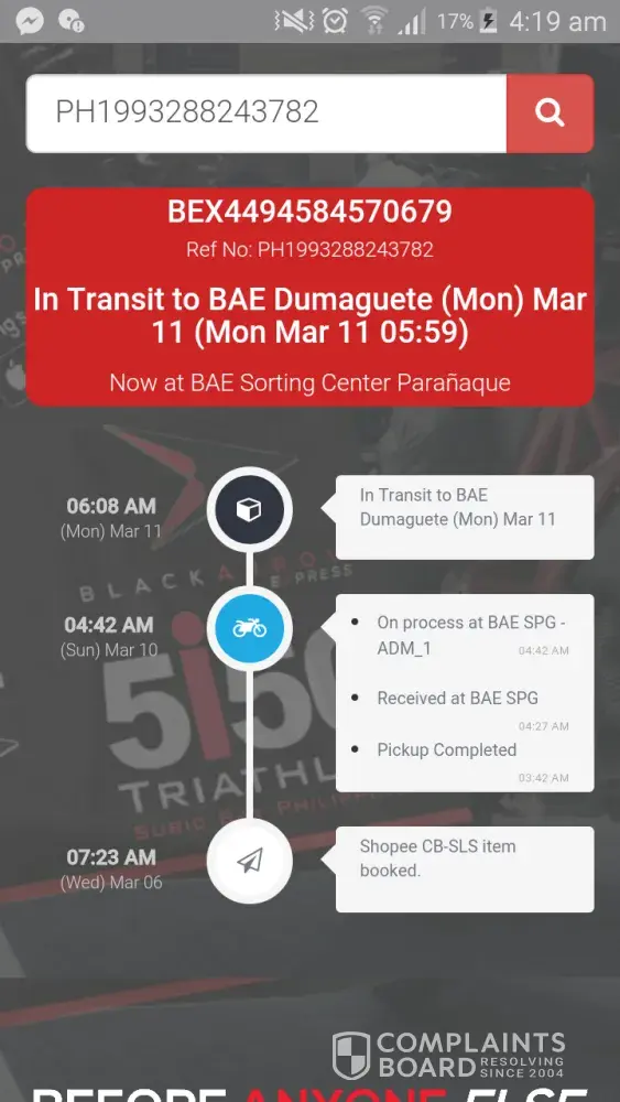The parcel I have been expecting to arrive was in transit to BAE Dumaguete since march 11. But it seems like it has not left BAE sorting center in Parañaque. It is now March 16 and I will be needing the contents of the parcel in March 18. It would be a waste buying something that I couldnt use just because it was delivered so late. PH1993288243782