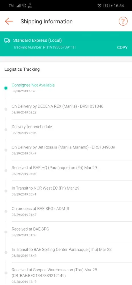 On the same date March 12, in the shopee tracker it said that consignee not available. I was shocked that this was marked as not available when the delivery guy did not even send me a message and failed to contact me.