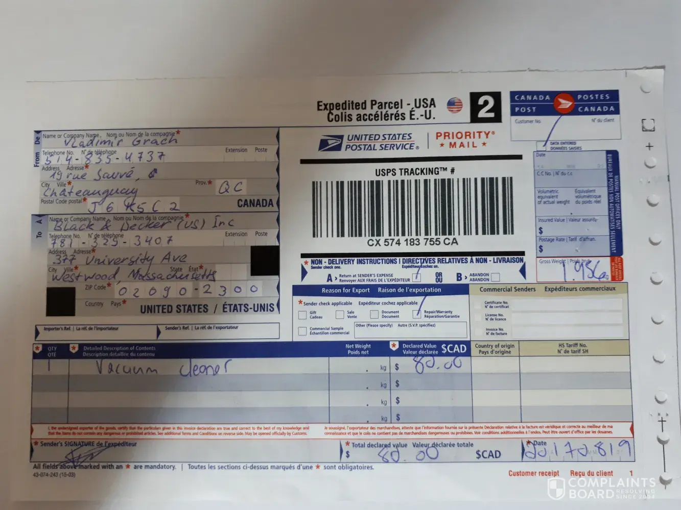 My name is Vladimir Grach. I had a Black & Decker vacuum cleaner that started to malfunction about 8 months after it was purchased. The warranty was still valid, so I sent it to a Black & Decker service center located in 377 University Avenue, Westwood, MA 02090, USA for a replacement. I live near Montreal, Canada. Now I know that there is a service center in Montreal, but when I sent it (August 19, 2017), the cell pone operator has identified the above mentioned center as the closest one. I didn't receive anything for two and a half months, so I decided to call the center to see what is the issue. I don't remember the name of the representative, but he said that the item has been received. He than said, that the replacement will take place, but because of the cross boarder issues it will take some time. I am a full time student. I don't have much time to deal with claims and phone calls. So I waited until after the Christmas holidays, and I called again. The representative said that there is no record of my vacuum cleaner, and since I didn't remember the name of the last representative I spoke to, there was nothing he could do. This is the way it was over, and I haven't received anything ever since. I just wanted to let you know that I am very disappointed with your service. Next time I will reconsider the choice of you brand.