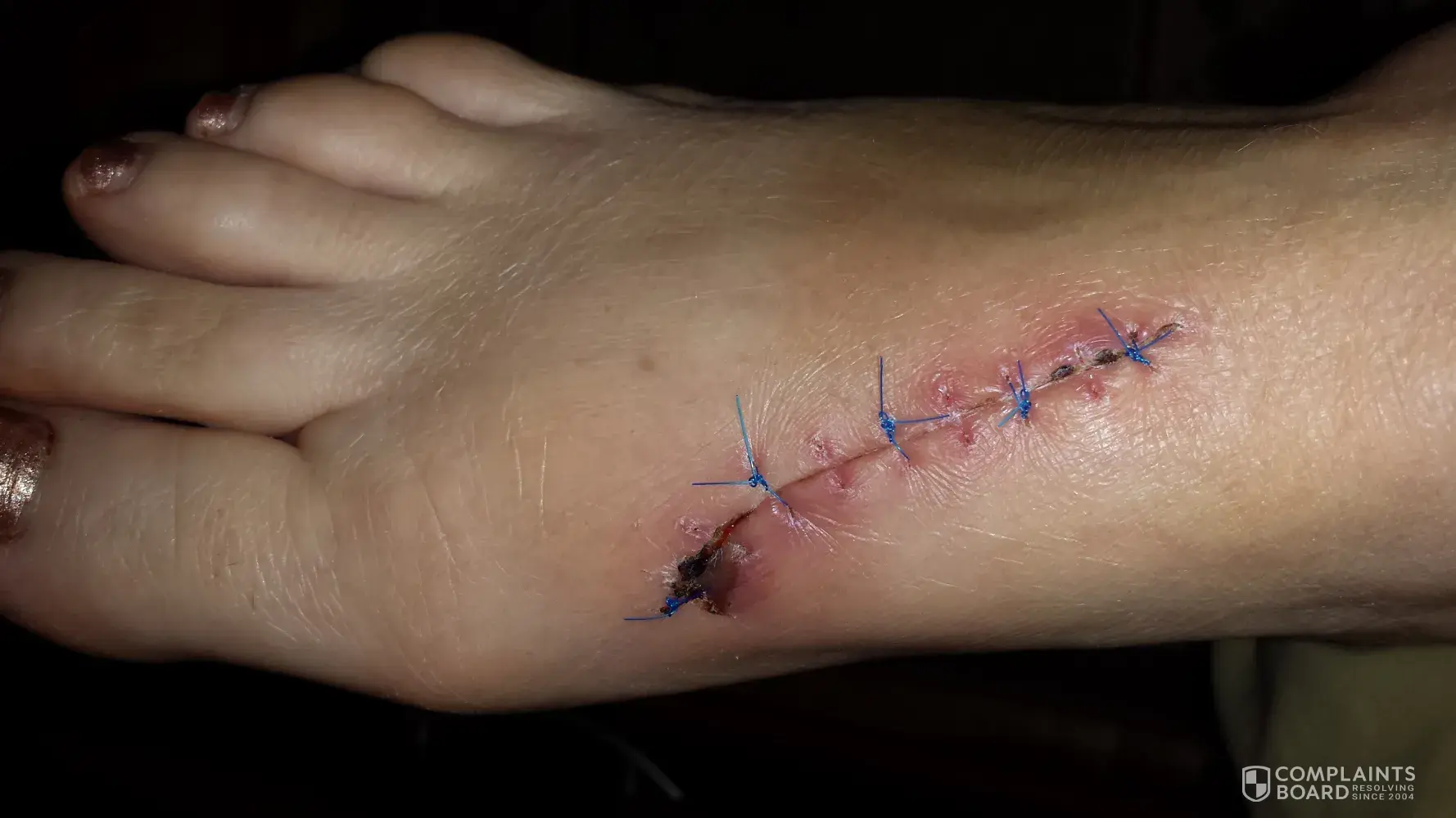 15:05 l'ambulance a été appelé sur les lieux car saignement était très intense. 15h30 arrivé à l'hôpital Ste-Eustache. j'ai eu 9 points de suture. Arrêt de travail. incapable de mettre des chaussures et de marcher normalement, nous sommes le 13 juillet 2018 aujourd'hui et je suis traité pour de l'infection dans la plaie. l'arrêt de travail sera un peu plus long.