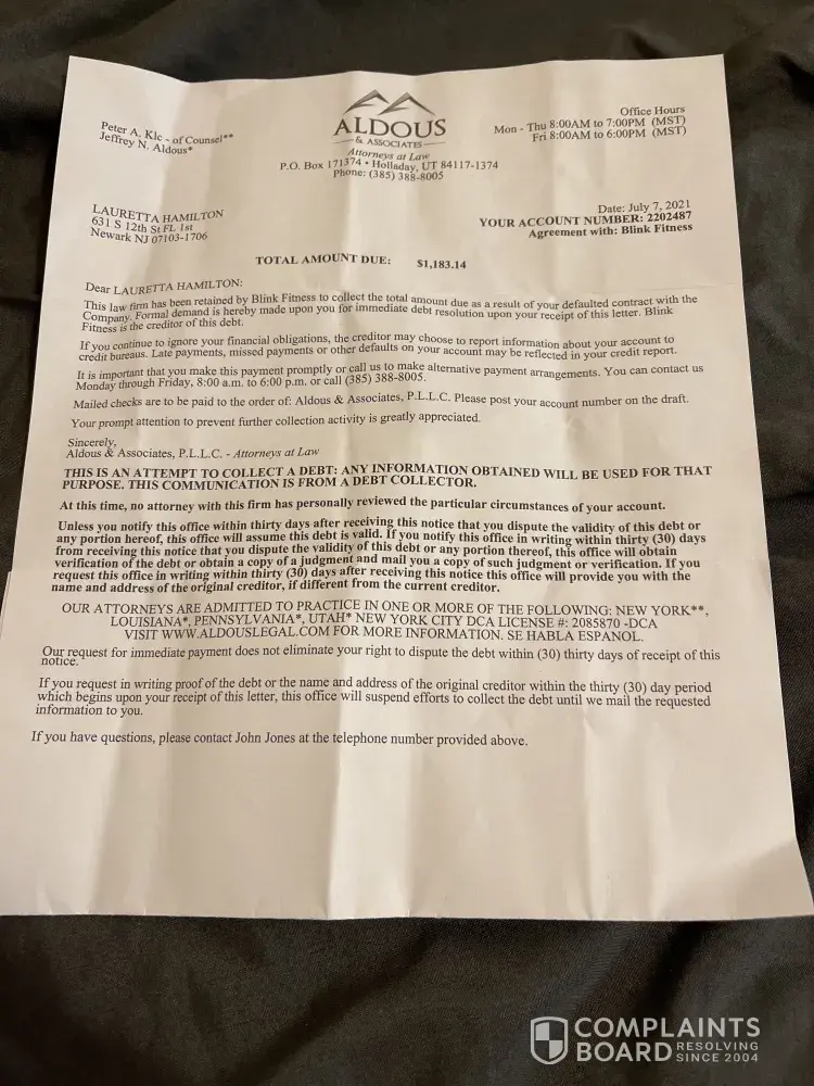 Blink Gym in Irvington, No has started a case with me with a credit agency named ALDOUS & ASSOCIATES ATTORNEYS at LAW in the amount of $1, 183.14, now I spoke to someone by the name of John and I told him that I don't agree with that amount & I do t have that kind of money it was just a PANDEMIC so he said that he needed the money to be paid in full or he...