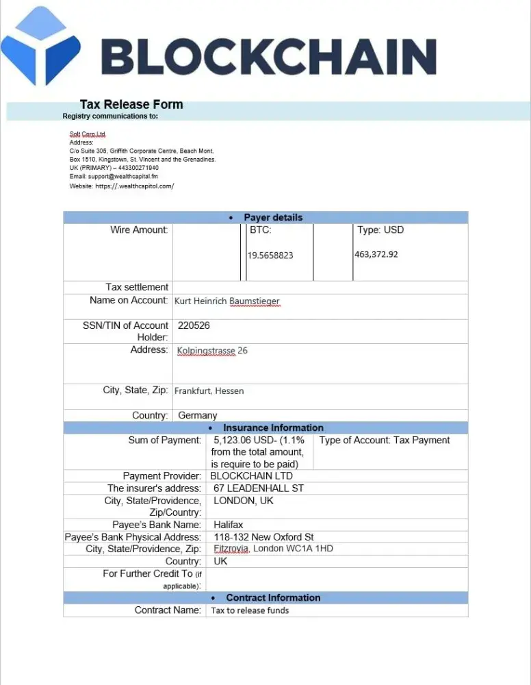 I have got the attached information. Can you check whether it is of Blockchain origin, fearing to be scamed. If not why am I requested to pay taxes in advance and why can they not be deducted from the sum and transfered to my accdount.