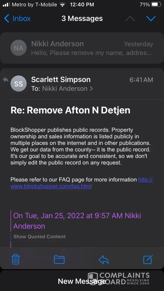I've already requested that my information be removed from block shopper and Scarlett Simpson emailed me to let me know they have no opt out policy. In many municipalities the names of homeowners will not populate an address out of concern for the safety of the property. I have been inundated with calls about purchasing my house to the point where I get several daily from random numbers even though I've blocked them. At this point they are facilitating harassment by paying Google to come up at the top of a search. If they get paid off my data whether or public or private I should as well.