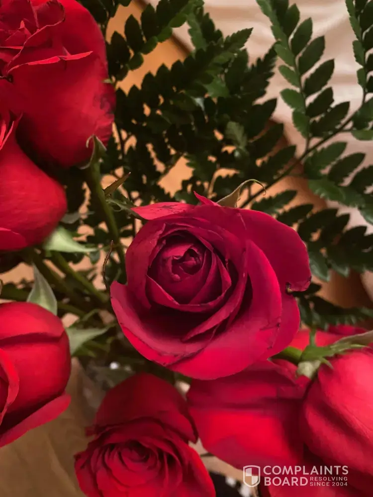I ordered one dozen gift boxed red roses, 16 days in advance, and I had the delivery set for today because they were for my sister's birthday. The order was supposed to be delivered between 9am-6pm today, but I never received an email stating that the item was "in transit". I waited for an email to arrived, letting me know that my order had been delivered, but I never got one. Around 5pm, one of my family members looked on our front porch and low and behold, there the box of roses were. The roses were left on the porch without the delivery person even ringing the doorbell or knocking on the door. When my sister opened the box, she discovered one dozen half dead roses, with parts of every rose black. They did not look fresh and it looked as if they had been sitting out in a room for weeks before they were packaged. Roses were losing petals and even moving the rose from the box, carefully, caused the rose petals to fall off. My family members have already placed a complaint on the complaints board regarding the company, as this is the second time we has used this service and I'll never use them again. I'm very unhappy with the service and condition of the roses. I have inserted photos of the damaged product and I would like to receive a full refund.