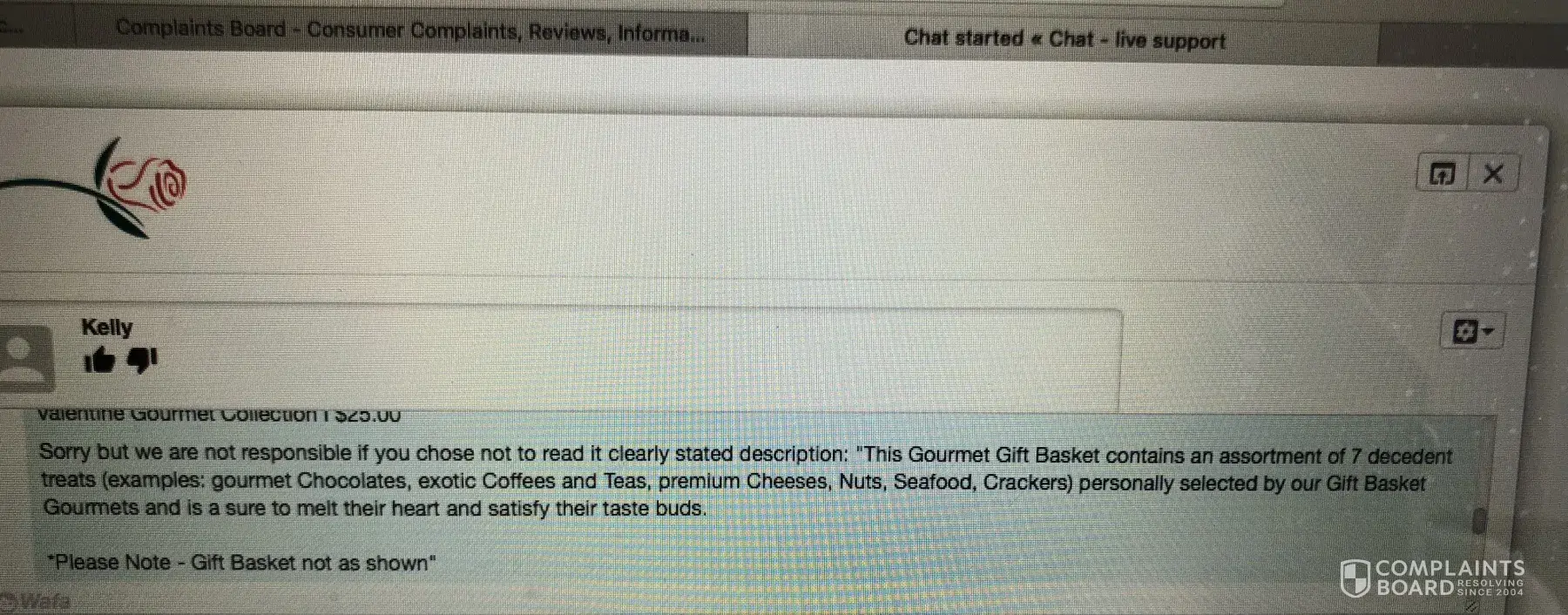 May 12. 2018 - Ordered flowers and a Gourmet Collection basket that was suppose to contain, according to them "This Gourmet Gift Basket contains an assortment of 6 decadent treats (such as gourmet Chocolates, exotic Coffees and Teas, premium Cheeses, Nuts, Seafood, Crackers) personally selected by our Gift Basket Gourmets and is a sure to melt their heart and satisfy their taste buds." There were NO coffees, Teas or Chocolates- there were two small boxes of crackers and a box with one cookie. They were suppose to deliver between 9 am - 12 noon, they did not arrive until 3:30 pm and were wilted by 6 pm. I contacted them via chat and was promised that a new bouquet would be delivered within 24 hours - it is now 1 week later and nothing was delivered. I sent an email Monday May 14 - the email said it would respond in 24 hours - 3 days later after more emails and unsatisfactory live chats they responded with lies and excuses. I was promised a call from customer service - that did not happen either! This has to be the worst customer service I have received in 61 years. Just continuous lies and excuses. I want a complete refund not a store credit because I will never use this company again.