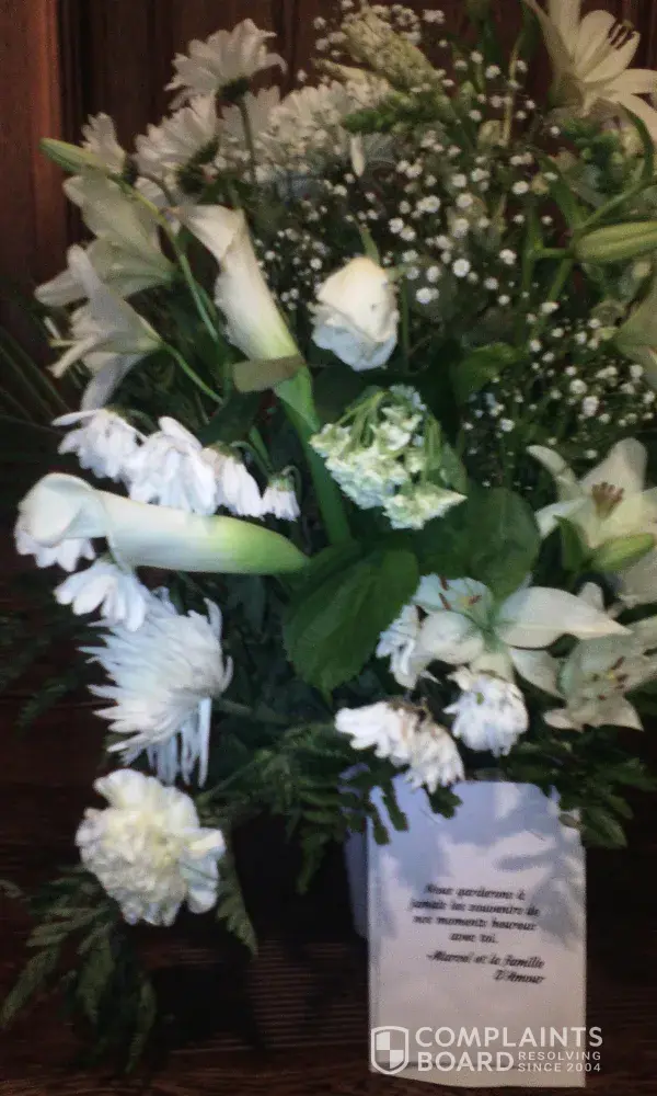On friday june 22nd 2018, I had a bloomex flower arrangement delivered to a funeral home in Ottawa, to honor and salute the death of a loved one. I chose the arrangement "loving lilies" described as elegant flowers such as creme roses, white lilies, delicate carnations, fresh eucalyptus and more. Approximately 27" W x 25" H. On the web picture you can see 8 creme roses, 11 white lilies and numerous buds, carnation and greens. Since the deceased was an important person to us I chose and paid for the deluxe version. We received a horrible bunch of flowers with only one rose which was already wilted, 3 cala lilies, some white lilies and the space left by the missing roses was filled with some cheap wilted chrysanthemum, wilted hydrangea flower some cheap carnation. We were horrified to see those flowers, they looked as if they had been picked up in the garbage of a cemetary. Bloomex advertises on it's first page "freshest flowers guaranteed". I was ashamed to see my name in that bouquet and we can never reclaim this moment and make it right.