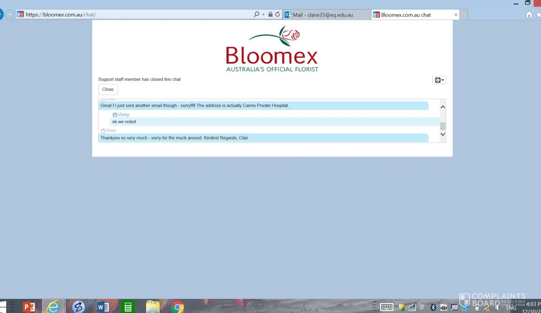 I emailed Bloomex again with correct address of Cairns Private Hospital. The recipient had been discharged but was transferred to another hospital, not to her home. I attempted to confirm this change over the phone. I was directed to live chat on the Bloomex site. My email also stated that I would attempt a live chat immediately to confirm new address.
