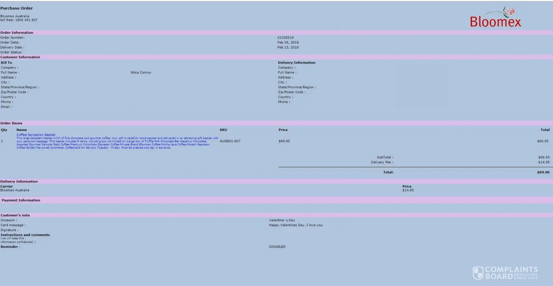 I ordered the coffee sensation basket which included 9 items (large box of truffle, milk chocolate bar, hazelnut chocolate, assorted gourmet sampler pack coffee, premium colombian espresso coffee, private brand bloomex coffee, mocha java coffee, mozart napoleon coffee, golden flavoured colombian coffee) for my partner to be delivered the day before valentines day a week prior to the date. Not only was the sorry excuse for a 'hamper' not delivered on the requested date, what I received has not a single item in common with what I received (focaccia crisps, pepper water crackers, petite de fruits, butter cookies, chocolate wafers, dark chocolate lint bar - 6 items). Thinking that they has sent the wrong hamper I rang their number to try and have this issue resolved so I would be able to still give something to my partner however due to it being valentines day they had closed their phone lines and I was advised to go to their online chat for an 'immediate' response. Two hours later after missing my lunch break I finally got an automated response asking me for my order number which I replied with and was subjected to another half hour of waiting again after which I received another automated message advising me to email them. I emailed them yesterday and today received a response saying ‘as per our policies listed on our website, in the unlikely chance we are sold out of particular product we are able to substitute with another similar product. Due to perishable nature of edible products and order volume, we reserve the right to substitute with similar product of the same value' and offering me a 20% coupon off my next purchase (like I would ever buy from these thieves again). Not only was there not 1 single thing is the hamper that was similar to my coffee hamper and effectively ruining my valentines day, the customer service is horrendous and they will not refund me my money. I will be submitting a complaint to consumer affairs and will never buy from this company again.