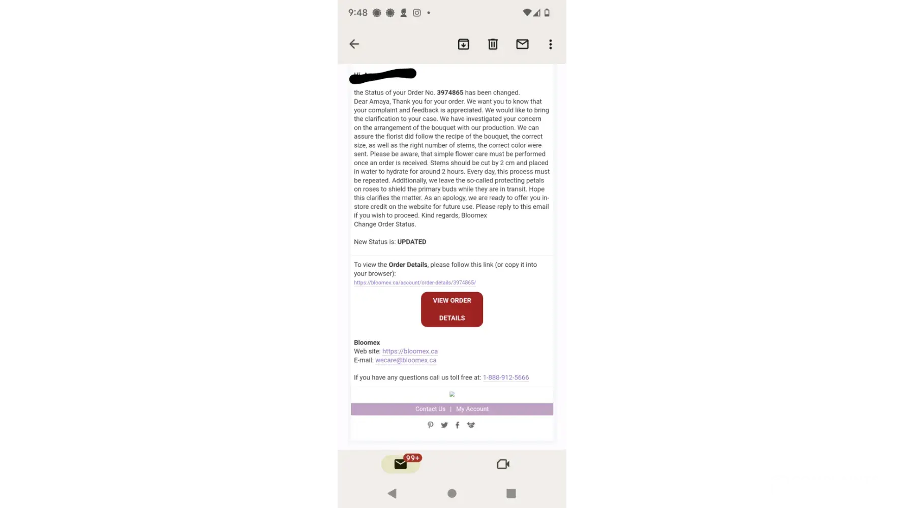 Bloomex is closed on Sunday so I called on the next business day, Monday, Feb 27. Because the flowers still hadn't arrived and the birthday had already passed, I asked them to cancel the order and issue a refund. That's when I was told the order was in transit. I did not receive an email indicating that the order was in transit. The status changed suddenly when I asked for a refund.