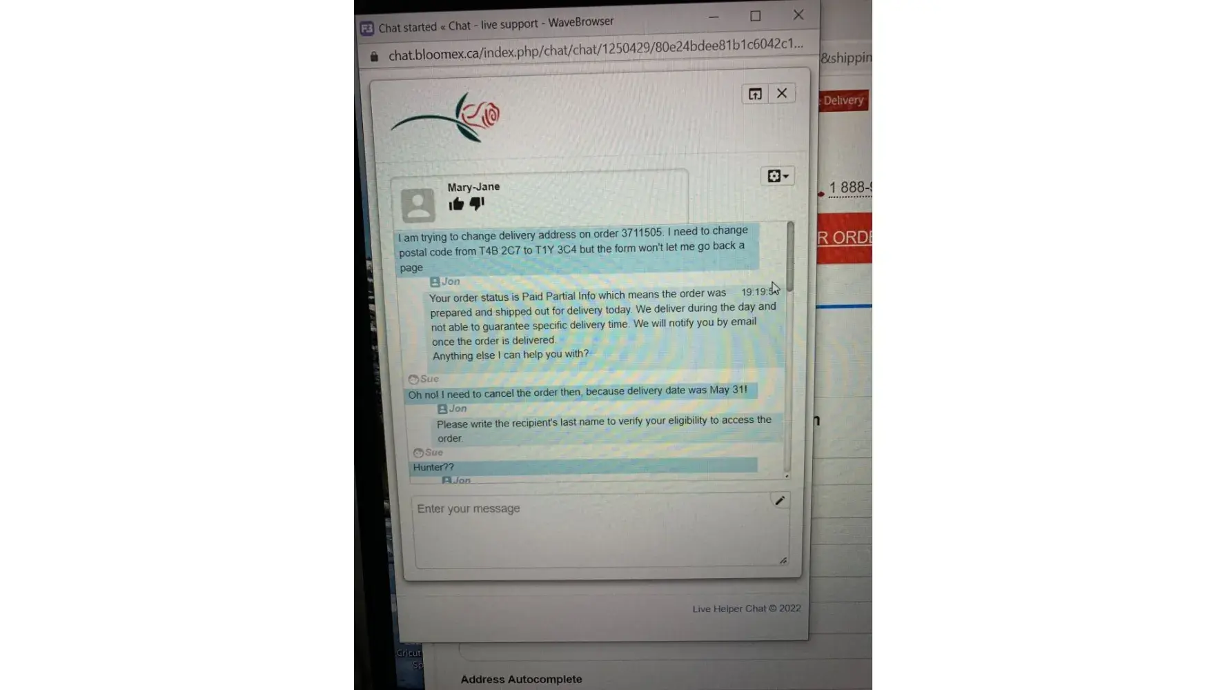 I entered the Bloomex website on May 23, 2022 and was assigned an order #[protected]. I NEVER pressed the submit order button, however, because my credit card was already on file by setting up my account, the order was processed by Bloomex. Then I received a message that my order was "on the way" when the order request date was a pre-order date of May 31. I immediately chatted on-line with an agent requesting cancellation and basically they said they would change and ensure the order date. After requesting several times to just cancel the order, they refused to do so. I called on the telephone line to customer service and three times I was hung up on. I followed up with an email and was advised the next day that I had to cancel within one hour. WHICH I TRIED TO DO as outlined by attached. Since nobody would help me cancel the order, I provided a delivery address (since the order was NEVER finished or submitted). The order arrived today and as outlined in the attached photo, my "Beautiful in Blue" order arrived not even close to advertised. The order I received was various shades of purple yellow & white 90% filler flowers. I have bought nicer and healthier bouquets at my local grocery store. One and done for me. I have told everyone I know about the horrific customer service I received, topped with the delivery of a pathetic vase of flowers. It will be viral and