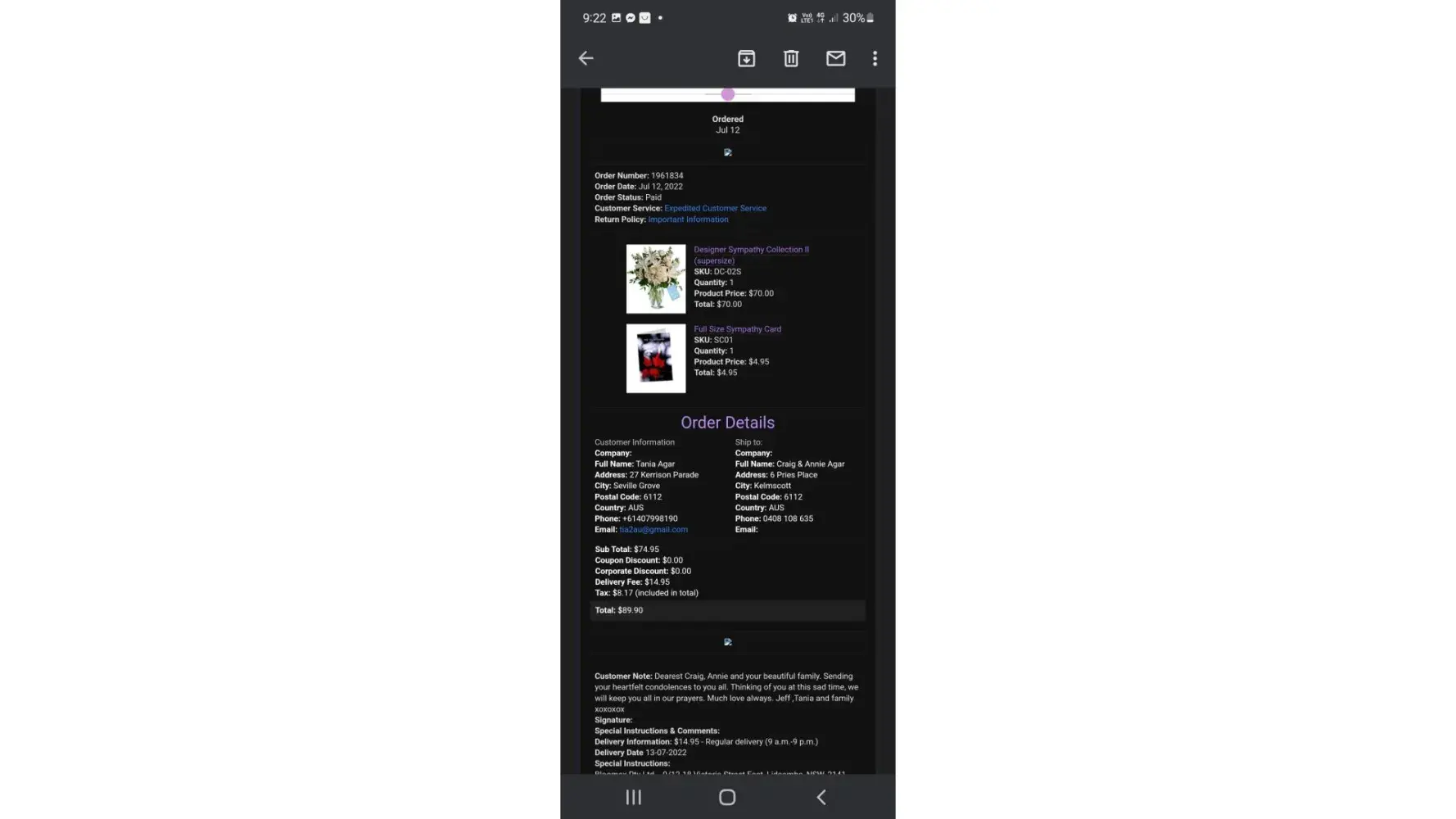 The flowers were delivered the day after on Friday 4/11/22, however not to their home as expected (they were both there) but to the local post office in a box that was crushed, apparently run over by a truck, and the flowers taken out and put back into the box with tape saying repaired by Australia Post.