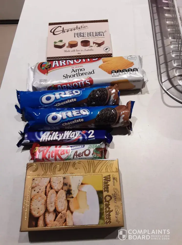 Delight crackers $2, Zucchini crackers $3, Old gold $3, Loaker Patisserie cream biscuits $4, Captain Table wafer $1.80, Ritz biscuit $1.00, Kit Kat $1.00, TV snacks $4.00, Lindor 38g $1.50, Tim Tam fingers $2, 00, Arnots Royals $3.00, Oreo biscuits $2.00, Lindt Coco $3.00, Lindt white chocolate $3.00, Lindt almond and hazelnut $3.00 Green and black chocolate $4.25 a total of $41.55 not to the value of $144 as stated on the website.