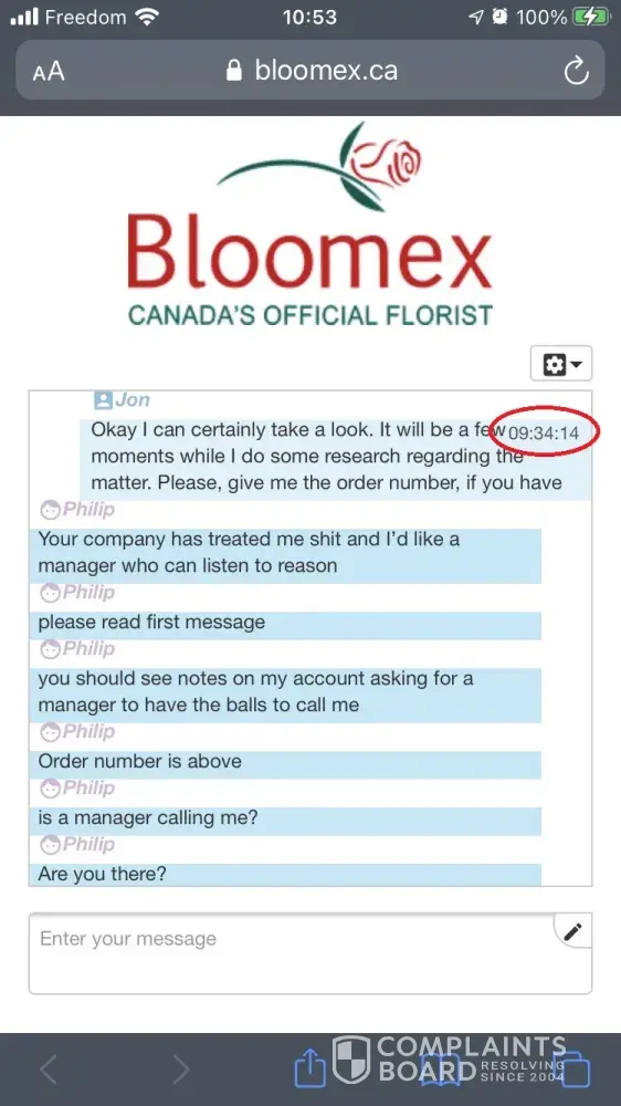 7. I call back to place an urgent note for the manager to call me URGENTLY. I'm told by your agents that they can't do anything and have zero power to sort this mess out. I'm not ever offered ANY recompense - just told a manager will reach out to me via email but they "can't promise when a manager will be in touch". it seems, your chat agents are not sure their manager knows how to use a phone and can't control how the managers will contact me to deal with customer complaints. smoke signals perhaps for all I know?- -- and via EMAIL!?!?! Why not call me to sort this faster?! I tell the agent to tell them to call me! - Bloomex Please Train your managers to have the guts to phone customers who you have let down and show us how much you [protected]@bloomex!