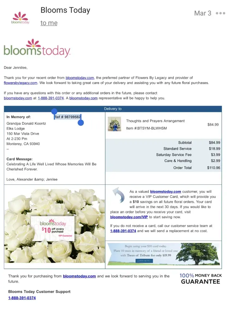Sister-in-law company ordered a plant that was supposed to be able to be replanted in the ground for my dad's funeral 3/18/2023. It was never received. I called Blooms Today "customer service" and they verified the order and said local florist said it was delivered but they could not tell me anything else or do anything because they have to speak to the sender. She said they would call the sender. I called back 1 week later and same story. I told them someone was supposed to reach out a week ago and I haven't heard a thing. She then said that usually they sender has to call them instead of them reach out to the sender. Then when I said the lady the prior week said Blooms Today would reach out, she back tracked and said yes in the notes it shows we did reach out but haven't heard anything back. My sister-in-law's company never received a thing from Blooms Today.
