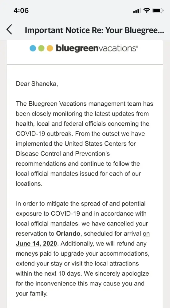 It's such a shame that our country is going through a crisis right now and Bluegreen Vacations won't give people their money back after canceling my reservation due to the coronavirus. The news was right. They're bailing out the big companies and the companies is screwing us. I wouldn't recommend them to anyone. Y'all gonna cancel my reservation months ahead and not refund me. What kind of world are we living in that you can be ripped off this way.