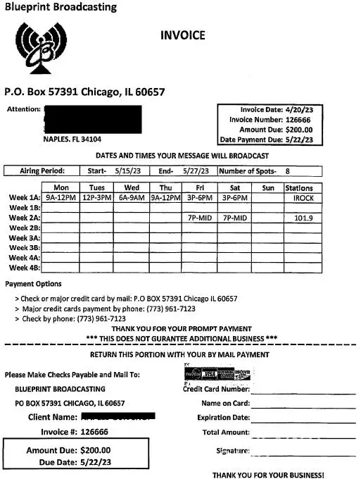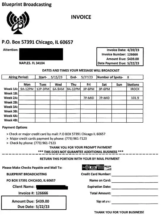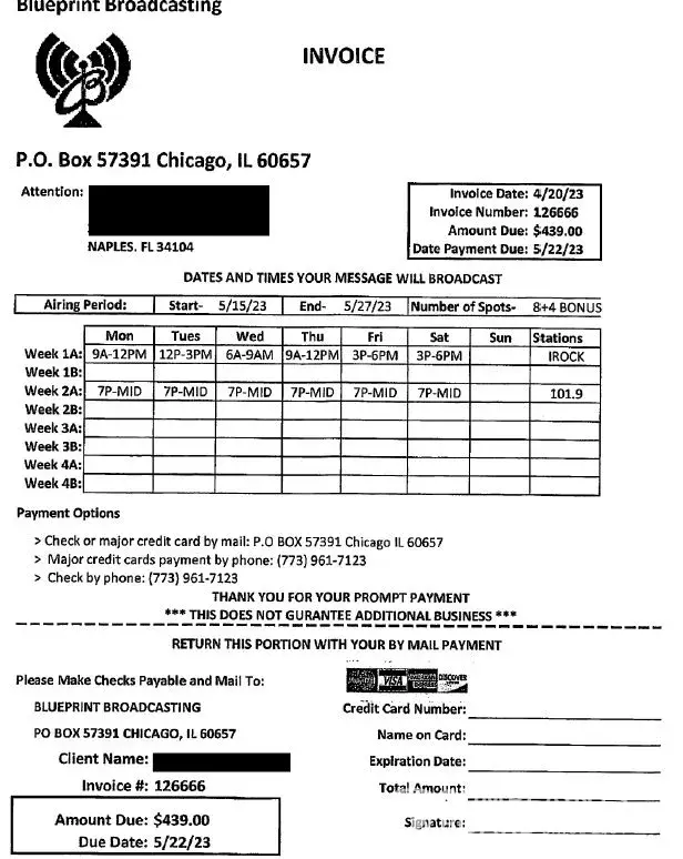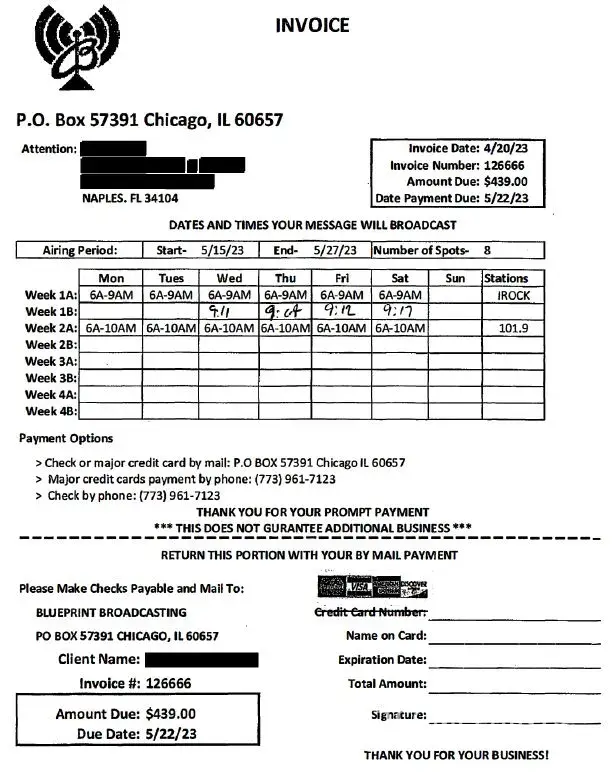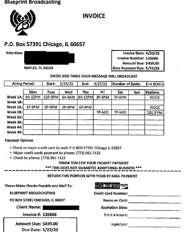 This company has no ties to radio stations at all. Their webpage is super basic and also not secure. They lie about doing the broadcasts. Lucky for me I was able to catch this prior to them broadcasting and I sent them a lengthy email to let them know about all the shadiness. I looked into both the radio stations that they promised to play on and neither of them have any links to Blueprint broadcasting nor show their logo on websites. Their website does not list the stations they control as a matter of fact. The next day they contact me to address this concern by giving me 3 free days at no charge. Except they had already promised that at the sales call. The invoices didn't match what was promised either. I told them I wanted them to cancel due to my research and the supervisor tried to tell me he can't cancel the broadcast. To which I retorted, well yes you can, you told me last week that it's all recorded live so you can just tell the guy reading it to not read it. Since I emailed them and tried to call multiple times prior to the first broadcast time, I decided to listen to the 3 hour time block and not once did the ad play, as a matter of fact the only ad that played was at the end of the block and it was for a different company altogether. The supervisor kept insisting that they were light but had no answer to why the radio stations I talked to had no idea who they were. Lucky for me I had multiple screenshots and proof of their scaminess. And I recorded the entire phone call, so when he finally said ok we won't run the ad and you won't be charged or billed. I was able to say Great, thank you, I have you on record saying that. He said that all these 1 star reviews on here are people that just didn't want to pay their bills. But in my case I canceled prior to the run time. I sincerely hope that there is someone that is doing research on them after a sales call and is able to use this to save them the trouble and headache. Also, please contact your local radio stations and let them know.