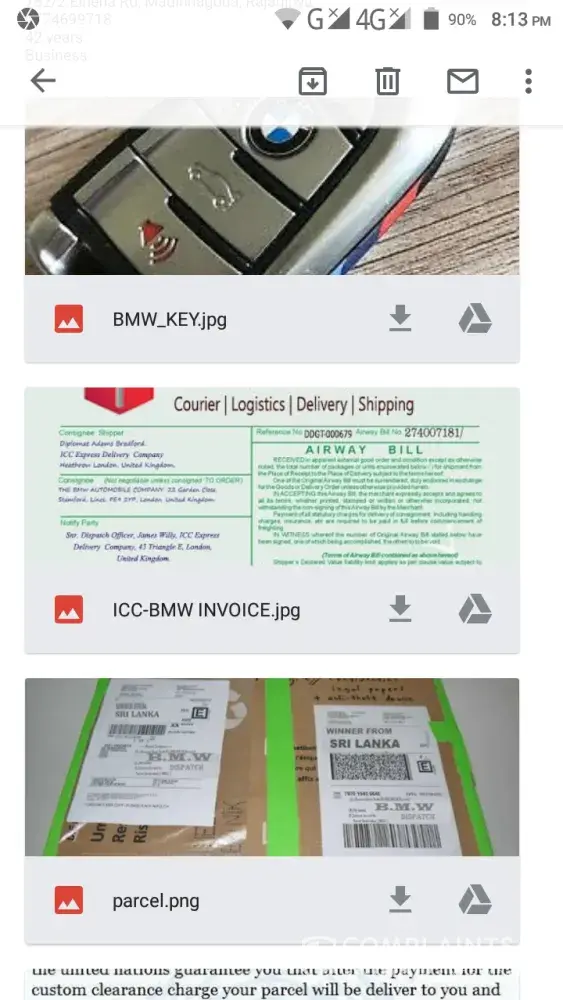 Please note that I received a email message from BMW automobiles UK a few days back that my mobile number has won a cash prize and BMW automobiles. Accordingly I gave my full details as asked by them. After a few days I received another email message that your cash prize & Car are reaching IGI airport New Delhi on 15th or 16th Sept. 2019 along with that their international delivery officer Mr. Phillip Morris. As per such details I came to know the car was shipped via Global Couriers Express & reached the IGI airport New Delhi. On receiving the above details I sent a total amount of Rs. 85700/- to the place where they asked me to send. Now the lady called Mrs. Anila Kumari @ RBI and the rep.of BMW are asking me to pay an addtiomal amount of IND Rs.97800/- for want of Anti-terrorist cetificate from concerned authorities. Now I would like to know that the above matter is a fake, false and a fraud one or it is true. The mobile nos. of Mr. Phillip Morris is +[protected] & Mrs. Anila Kumari is +[protected]. Please let me know the same immediatly. Matter most urgent. Now I would like to know whether my hard earned money is gone for a fraud or it will fetch some thing better. Awating for a favourabe reply from your end. Thanking you, Your's faithfully, Shrihari Y. Bhat