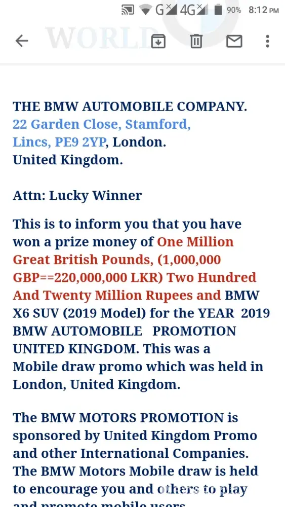 This is to inform you that you have won a prize money of One Million Great British Pounds, (1, 000, 000 GBP==220, 000, 000 LKR) Two Hundred And Twenty Million Rupees and BMW X6 SUV (2020 Model) for the YEAR 2020 BMW Automobile Promotion United Kingdom. This was a Mobile draw promo which was held in London, United Kingdom.
