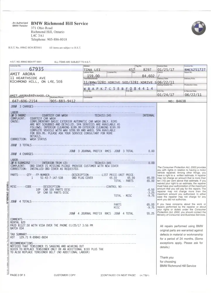 My family has been a loyal BMW cutomer since past 12 years and have been visiting BMW Autohaus at 480 Steeles Ave W, Thornhill, ON Canada L4J 6X6. They advised me to visit BMW Autohaus since I got my first BMW. I purchased a used BMW 328xi in 2016 VIN WBAPK7C58BF084414, and have been going to BMW Autohaus Located at 371 Ohio Road, Richmond Hill, ON L4C 3A1 for all my service needs since then. In October 2016 I went there for an oil change and windshield water leaking, it had 78, 248 KMS on it when the oil change was done, then in January 2017 for coils and sparks plug replacement and then on 8th March I went in again because of a rattling noise coming from the engine when i accelerate. I was advised that the engine has to be replaced and there were metal pieces found in the filter. At this time my vehicle had 87, 059 KMS on it and it still shows 5000KMS left for next oil change. So I thought I should get a second opinion on it. I went to a certified body shop and explained what’s happening, the technician asked me if tensioner belt ever broke, I replied no, so he said he is going to check the oil filter. So he pulled out the oil cap and called me to see that the cartridge and spring were missing a plastic cap with another tiny rubber part that covers the spring. He explained to me that your vehicle has been running dry on cold start as the function of the plastic cap and that tiny rubber part is to bypass the filter when it’s required. As a result of missing parts, your engine is broken and has damaged. He suggested me to contact BMW Autohaus as I got my last oil change done from there. So I took pictures of the broken part and contacted Tina Lei (Service Advisor) BMW Autohaus and I asked her why the parts is missing from the oil filter cap. She asked me to forward the images on her e-mail as she wants to show the images to the manager. I forwarded her the images on March 17th but due to the size restriction of the attachment, she did not receive all the images. So I reduced the size of the images and sent it to her again on March 21st. Tina called me and said that I can come and see the manager on weekdays anytime from 7:30 am – 4 pm on weekdays before April as he will be in training first week of April. So I went on Friday 24th March and had a conversation with the Service Manager (Rad Zonta), Tina Lei (Service Advisor) and the Technician in the manager’s office. The Service manager is quite aggressive and needs to calm down and understand the situation first before calling me in for a discussion. He did not even know what part was missing until I showed him the picture and the technician from Autohaus explained to him in front of me what exactly is missing. This is after having a conversation for about 15 minutes. So, the manager is discussing something with me which he is not even aware of in the first place and showing aggression. The technician claims that even if a BMW is running without a filter and the missing parts (as in my car) it will run fine. He also gave me a good example of a failed motor for the VP of BMW at 7000 KMS. All I asked is that they could have recommended me a replacement for the oil cap as they did the oil change and even after that when my car came in on March 8th. No one recommended me to change the oil filter cap even though it was missing parts. I also asked the manager to see the camera footage for 8th March that will show if my oil cap was inspected properly or not because Tina mentioned to me that everything in the oil cap was inspected properly. The manager also said to me that you believe BMW is a big brand and that is why you came here so that you can get your engine replaced for free, the technician also said even if your oil cap was replaced, you would have come here for reimbursement for that. The manager has no respect for the guest, I have experienced it yesterday and I am very disappointed with his reaction to all this. He certainly needs to calm down and handle concerns as a BMW representative and not get personal by saying to the guest you are here to get your engine replaced for free. I asked them to provide me with a written document which states that a BMW engine will not be damaged if it is missing the same parts as my BMW. I was told it is not a fair request and it was denied. No recommendations were made to replace it at any time of oil change, or at the time of an inspection done on March 08th.