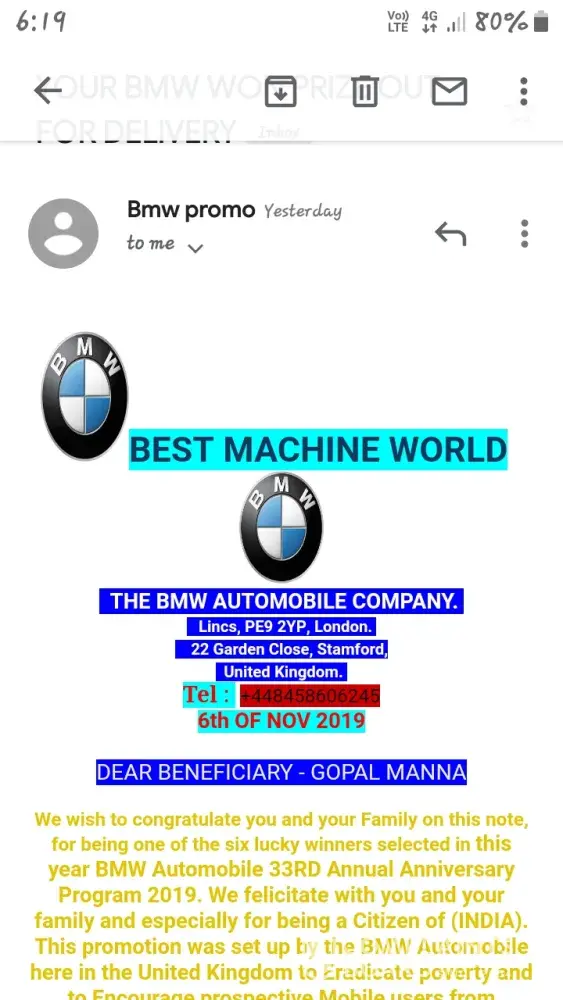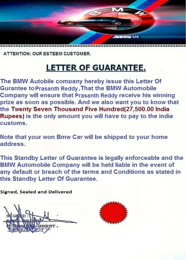 Iam Prasanth kumar reddy...i also received a mail from bmw company...is that fake or true...