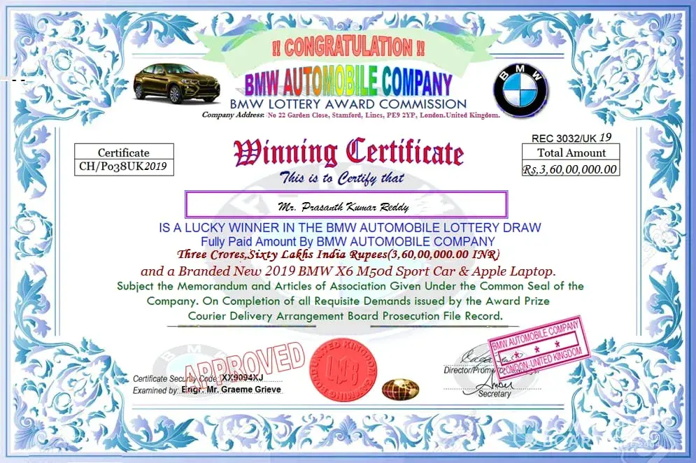 I have received massage lottery winning the bmw automobile UK company So if it fake or true send. Me variefie mail or this is froude why doing this in you company name