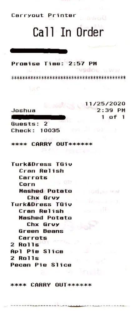 We decided to order take-out turkey dinners from the Bob Evans restaurant in Massillon, Ohio for Thanksgiving. To try to avoid the rush we placed the phone order at 2:39 PM in the afternoon on the day before Thanksgiving, Nov. 25, 2020. We were told on the phone the food would be ready at 3:00 PM. We arrived at the restaurant at 3:00 & paid for the meals but the food was not brought out to us until 3:55, meaning we had to wait for nearly an hour! The reason we ordered take-out was because during this time of a large increase in Covid 19 cases we wished to minimize contact with other people as much as possible. But we were forced to sit & wait inside the restaurant, being exposed to many other people there for almost a full hour. When we got home we found the order was incorrect & incomplete. One dinner was correct but was missing the cranberry relish that was supposed to be included & there was no butter for the rolls. The other dinner was a disaster. Instead of turkey & dressing it had chicken fried steak. Instead of the ordered green beans there was corn. Again this "Thanksgiving Special Turkey Dinner" had no cranberry relish & no butter for the rolls. After having to wait nearly an hour for our food initially we were certainly not going to go back to the restaurant to try to get the problems corrected! Bob Evans, I am very disappointed with your service and it's very unlikely that I will ever order take out or eat at this restaurant again. I would be happy to email you a copy of my receipt showing the details of this order if you will provide an email address.