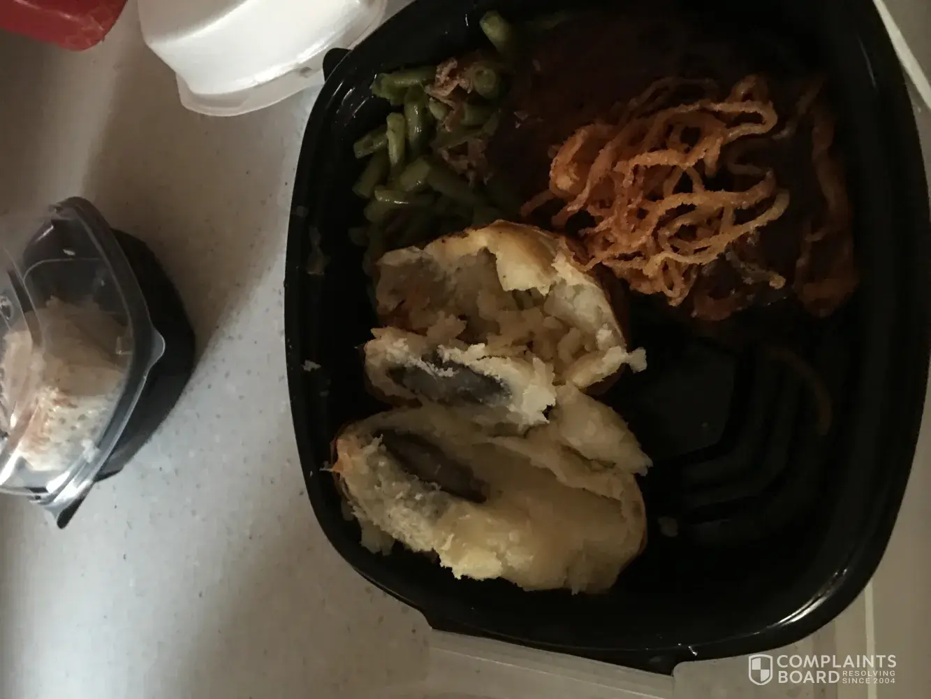 I couldn't believe it when they served us this potato. Very disappointing. The food at the Marion Ohio restaurant is getting worse every day. First, I ordered fried chicken, dark meat, they were out of chicken. Who runs out of chicken? Had to then order the meatloaf. I ordered the flounder, got the salmon, which was too dry to eat. This was a carry out order.