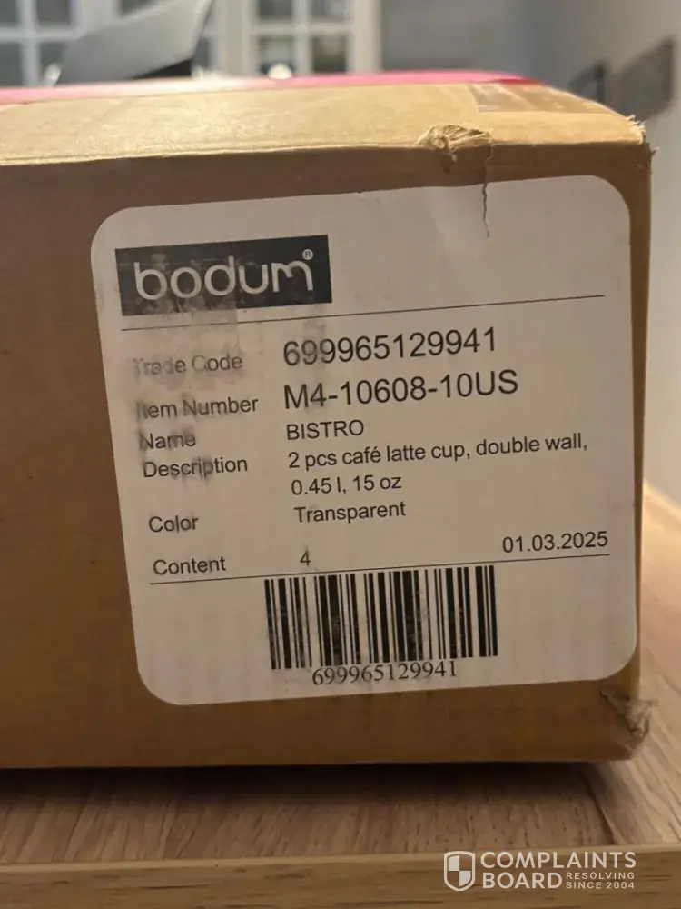 Read full complaintBistro cafe latte coffee cups 10608-10US received broken. No response from Bodum