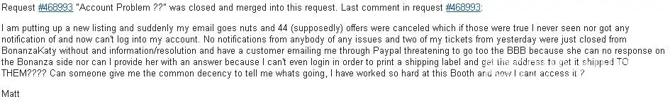 Great customer satisfaction rating and about 30 sales. Out of nowhere 44 emails canceling negotiable offers from users on products that i sold even though i never received any notification (Obviously offers didn't exist) . All my seller fees were paid minus the renewal of there bloated pro seller membership but that just knocks you down to a basic seller if you choose not to continue. Then i suddenly couldn't login, i opened support ticket after support ticket asking why i could not login and i had 2 orders that my customers paid for and i needed to print shipping labels for. . . Guess what? No response ! Not one ! Not even the common decency to say i'm suspended, banned, nothing ! Honestly i had great ratings i'm completely speechless ! I've paid them more in there "superior" selling fees and again bloated pro membership (Was giving it a chance) then what i actually profited ! Please don't waste your time with the a copy / paste "safe" response that i have seen time and time again after a quick simple google search> we are sorry for the not so good experience you have had on our site. We are dedicated to doing our utmost to assist you in anyway that we can. If we can be of further assistance to you, please contact us at [protected]@bonanza.com so we can properly assist.