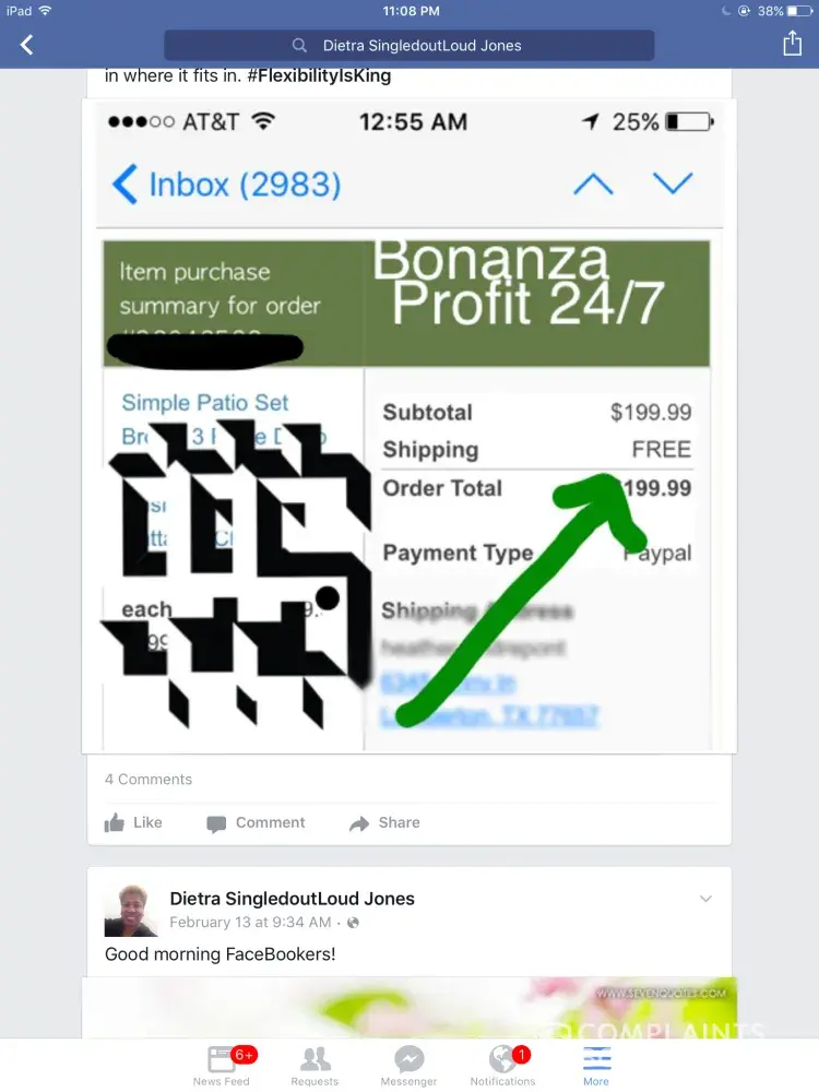 Here's my sales transaction that she proudly posted on her f.b. Page, it's just to bad that she failed to mention that she didn't ship it and kept my $ and has the patio set relisted right now! Oh, I failed to mention that she claims to be a good, Christian lady! Yea, ok too bad her greediness overcomes what and who she claims to be... Not only is she on bonanza but eBay, along with Amazon and has a business named singled out loud and UpperHand! Yeah, UpperHand on your money! Buyers, please be aware of this seller! Even though this lady did me wrong I will still pray for her and that she utilizes her heart and will learn to be caring and not selfish! After all, this patio set that I bought was for a surprise party for my 11 yr old daughter for having a successful brain tumor operation and this seller knows that too! Down right shameful! I think her seller name on Amazon is DJ. With all those different alias that's a red flag right there! I plan on filing a report on her tomorrow with my local p.d.