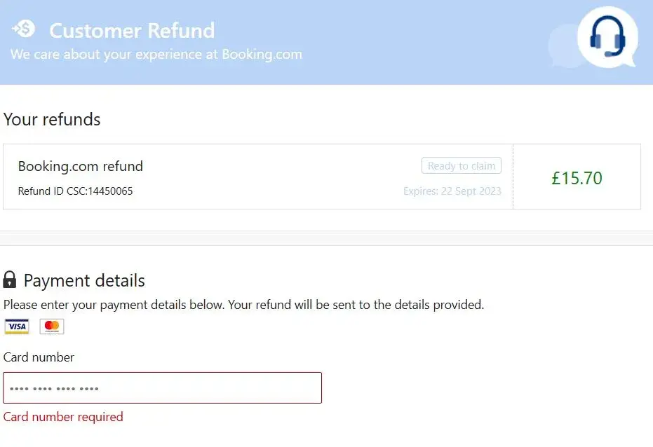 I have tried numerous times to contact booking.com who keep on asking for my credit card details as this is the easiest way for them to refund.