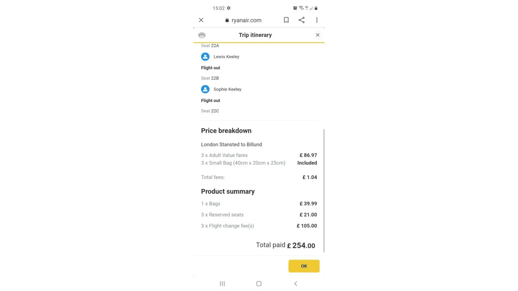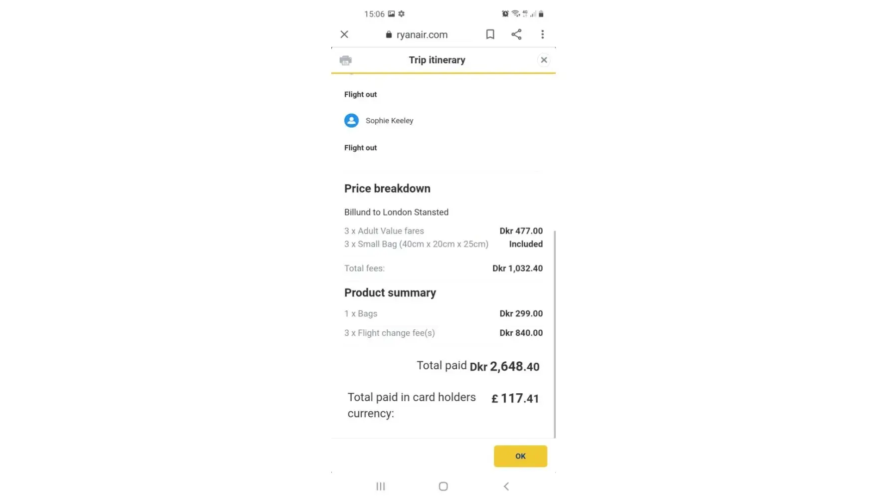 Please find attached a receipt from Ryan Air for 100 Euros (that I have sent to customer.[protected]@support.etraveli.com). This relates to the charge I had to pay at Barcelona Airport for two cabin bags (40 Euros) and two check-in fees (60 Euros) despite the fact that I had already paid for luggage and the check-in through Booking.com. This does not include the exchange rate charge from my bank which will be yet another cost to me for something I had already paid through Booking.com.